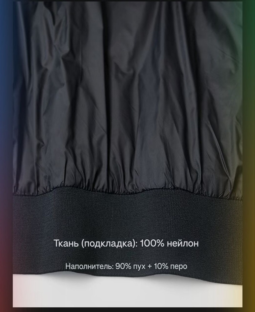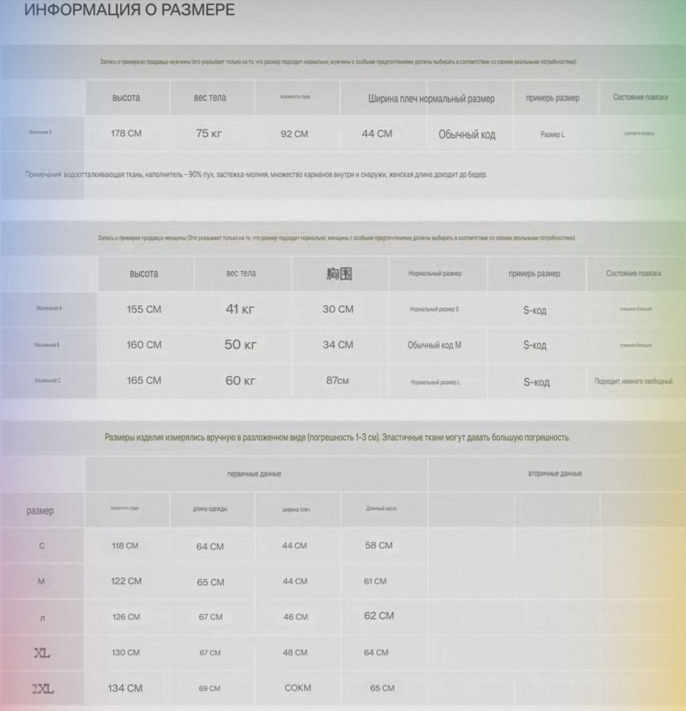 Наполнитель - 90% пух, 10% перо Даа цвета: черный, темно-синий Размеры: S M L XL 2XL Вес ~0,75 кг Комментарии к товару
