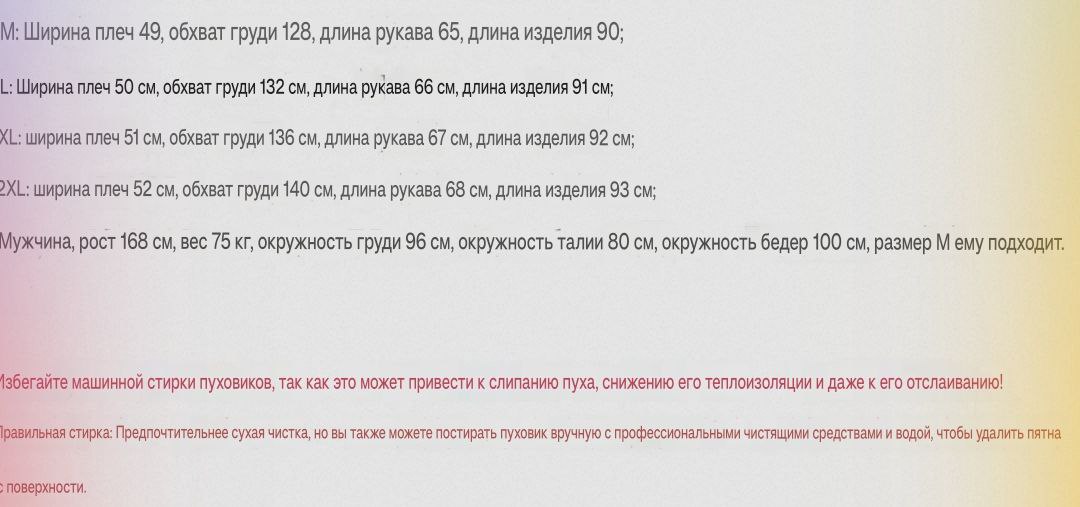 Наполнитель туловища и рукавов: 50% утиный пух и 50% перо