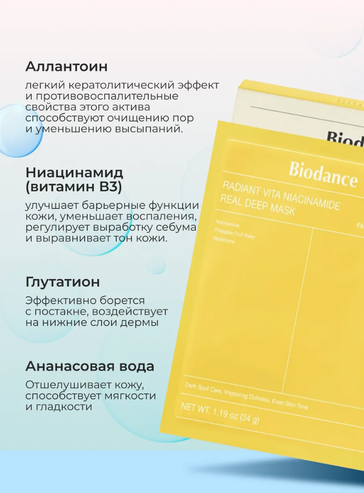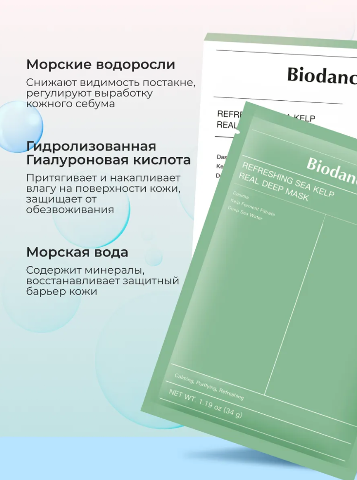Цвет: Зеленый ( с морскими водорослями), Розовый (с коллагеном), Синий (с пантенолом и церамидами), Желтый (с ниацинамидом)