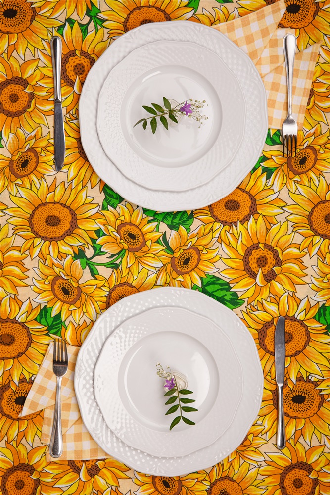 Сезонность: лето | весна Набор из скатерти и 6 салфеток в стильной расцветке. Ткань рогожка плотностью 150 гр., размер скатерти 150*180 см, салфеток 35*35 см. Скатерть с подсолнухами, салфетки в клетку