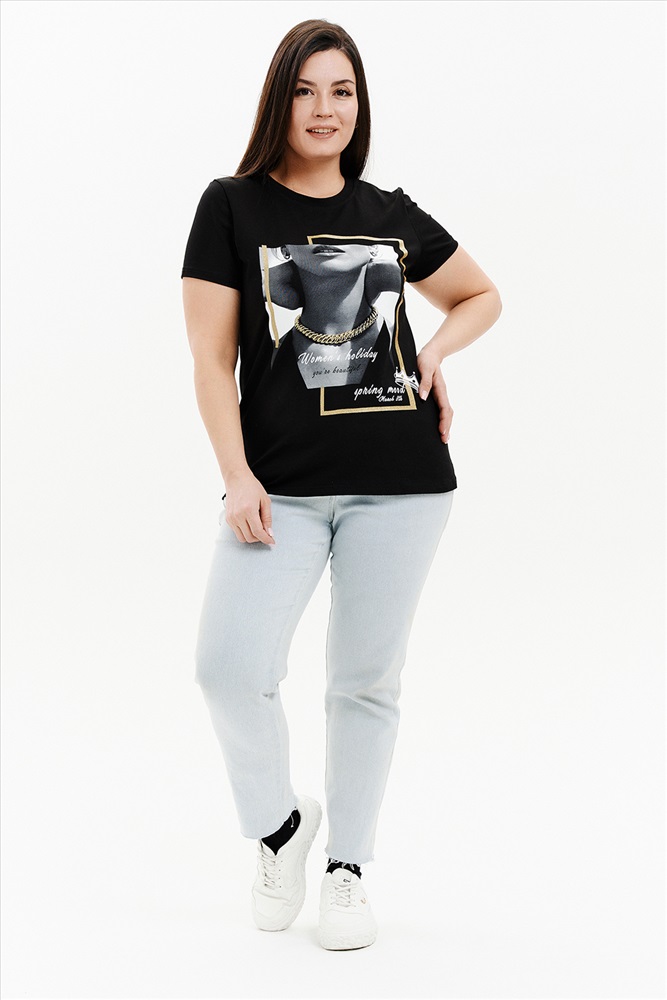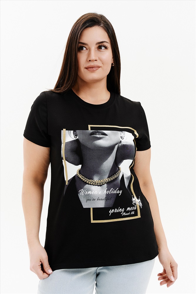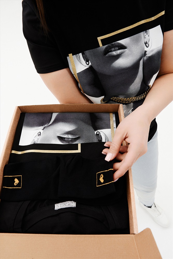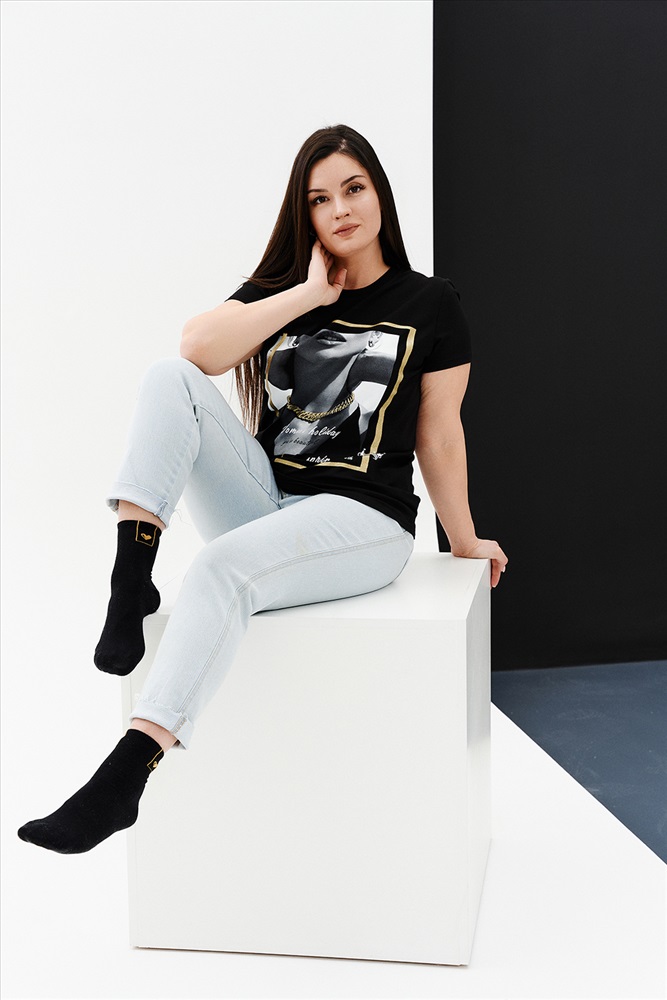 Подарочный набор НЕЗНАКОМКА. Черная женская футболка с принтом и носки с принтом подчеркнут вкус и чувство стиля. Подарочный набор упакован в крафтовую коробку с тематическим принтом. Футболка из хлопка и лайкры подойдет для повседневной носки и для выхода из дома. Футболку будет удобно носить навыпуск или заправлять, отлично сочетается с юбкой, брюками с джинсами, а также можно надеть под пиджак, жакет или кардиган. Футболка будет отлично сидеть практически на любой фигуре. Носки подойдут к любой одежде и обуви. Изготовлены из высококачественного хлопка, который отлично впитывает влагу, пропускает воздух и подходит даже для самой чувствительной кожи. Хорошо сохраняют форму и цвет, устойчивы к истиранию. Подарочный набор НЕЗНАКОМКА будет отличным подарком второй половинке, близкой подруге, маме или сестре. Рост модели на фото 165 см, размер 48. Размер носков 23-25.