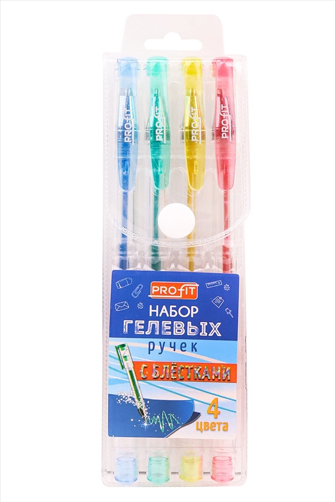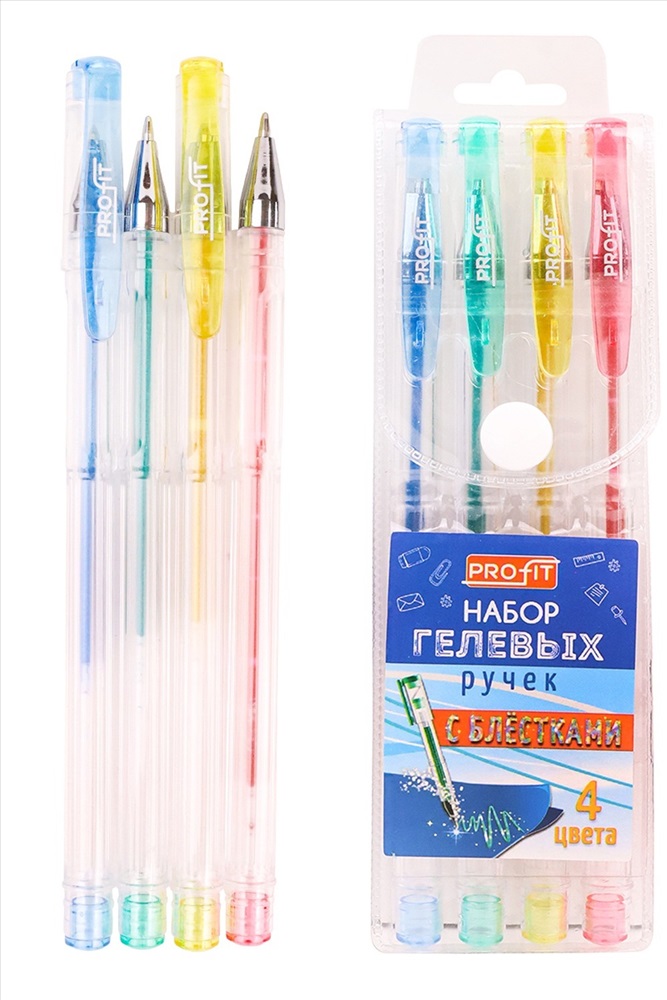 Модель: Набор ручек гелевых 4шт,4цв, с блестками (НР-9915) в пластик. блистере Тип товара: ручка Бренд: Проф-прес Стиль: для школы Набор гелевых ручек четырех цветов. Ручки пишут легко и быстро, не требуют нажима. Быстро высыхающие чернила не размазываются и имеют насыщенный цвет. Упаковка: пластиковый блистер. Таблица размеров и веса