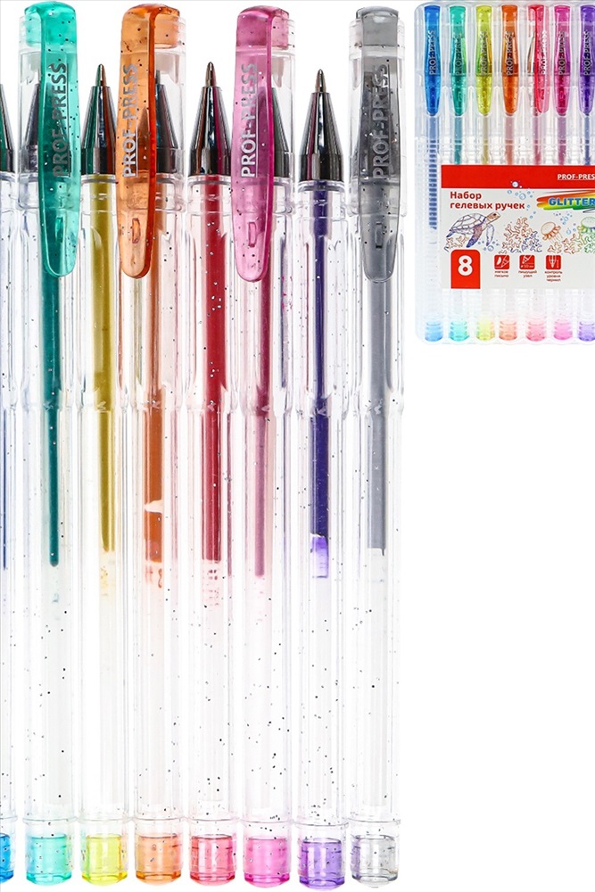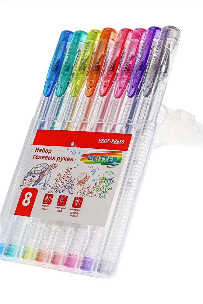 Стиль: для школы Набор гелевых ручек из восьми цветов с блёстками. Ручки пишут легко и быстро, не требуют нажима. Быстро высыхающие чернила не размазываются и имеют насыщенный цвет. Упаковка: пластиковый блистер.