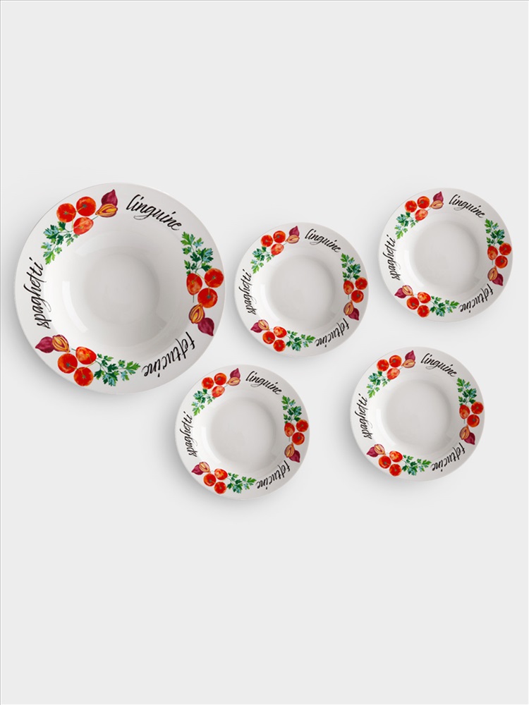 Набор тарелок, 5 предметов. Комплектация и размер: тарелка, 27 см - 1 шт; тарелка, 22 см - 4 шт. Материал: фарфор Porcelain. Соответствует требованиям ГОСТ 28390-89 п.п. 1.2.8, 1.2.14; ГОСТ Р ИСО 6486-2-2007 п.4. Мыть теплой водой с применением жидких моющих средств. Можно использовать в микроволновой печи и посудомоечной машине.