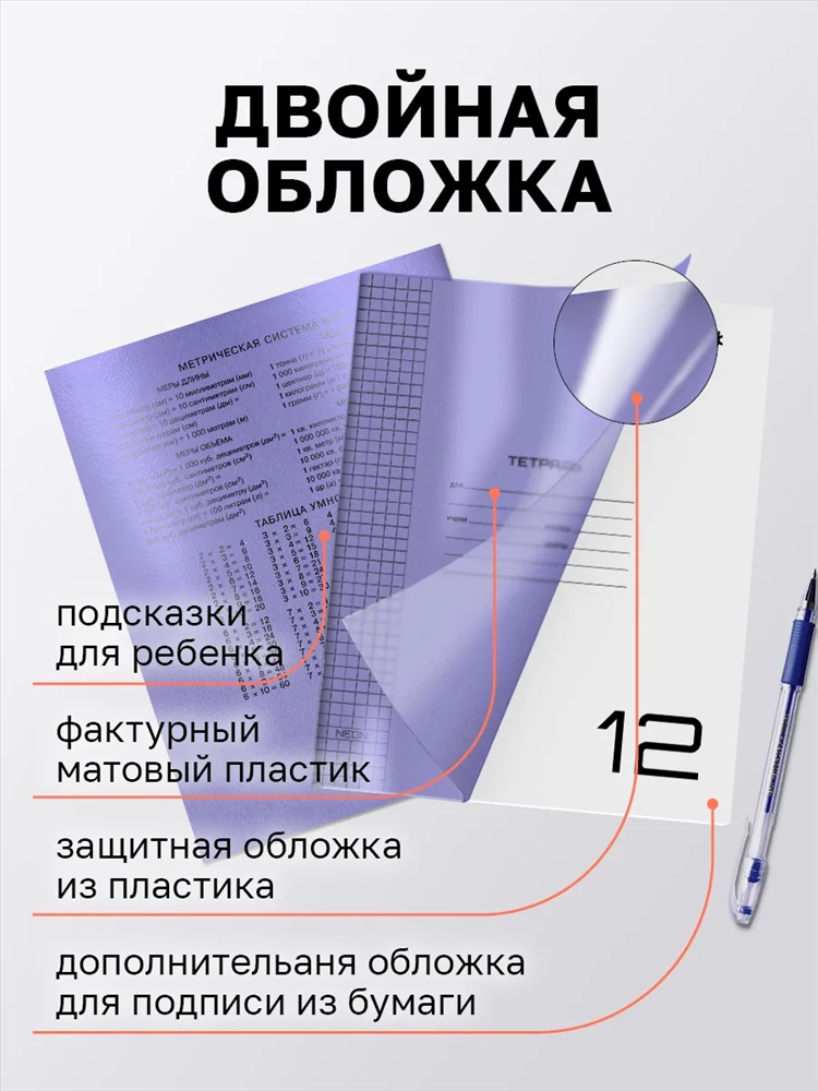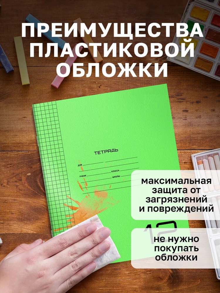 Стиль: для школы Тетрадь с пластиковой обложкой12 листов в клетку 10шт в упаковке это надёжная защита и стильный дизайн в одном решении. Тетрадь оснащена двойной обложкой: прочный пластик снаружи и гладкая мелованная бумага внутри. Тетрадь сохранит школьные записи в идеальном состоянии и защитит от любых неприятностей: влаги, царапин и замятия в рюкзаке или ранце. Вам больше не придётся тратиться на приобретение отдельных обложек. Пластиковая обложка имеет оптимальную плотность 180 мкм: достаточно прочная для надёжной защиты, но при этом гибкая и безопасная даже для самых маленьких школьников.