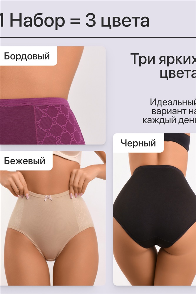 Рисунок: узоры Набор трусов 3 шт. хлопковые высокие. Это превосходный выбор для девушек, которые ценят комфорт и элегантность в одежде. Изготовленные из мягкой и прочной ткани, они идеально подходят для женщин любых форм, обеспечивая идеальную посадку и поддержку. Благодаря удобному крою и эластичной резинке в поясе, эти трусы обеспечивают идеальную посадку и не натирают кожу. Такая модель отличный выбор для повседневного использования или особых случаев. Благодаря своему дизайну, они будут выглядеть потрясающе на вашем теле и придадут вам чувство уверенности и сексуальности в любой ситуации!