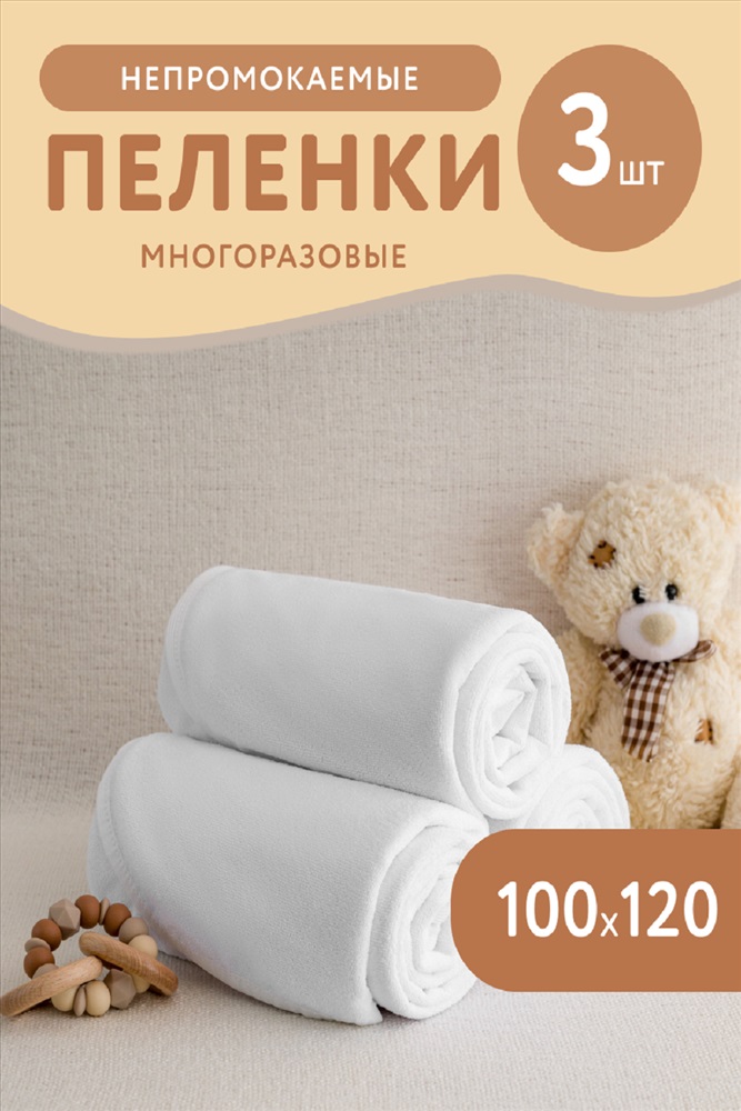 Сезонность: лето | осень | весна | зима Многоразовая непромокаемая пеленка - незаменимая вещь, которая поможет в уходе за вашим малышом, либо за пожилым лежачим человеком. Непромокаемую пеленку можно использовать в детской и взрослой кровати, коляске, на пеленальном столике. Непромокаемая пеленка защитит ваш диван, кровать, матрас, коляску и пеленальный стол от намокания. Непромокаемую пеленку можно использовать: при посещении доктора;во время массажа;когда переодеваете малыша;во время принятия воздушных ванн;в коляске;во время поездки в гости. В наборе 3 шт. размер 100*120. Верхний слой изготовлен из 100% гипоаллергенной хлопковой махровой ткани, а нижний слой выполнен из непромокаемого материала с полиуретановой мембраной. Края пеленки обработаны трикотажной тесьмой по всему периметру. Уход - машинная стирка при 30С.