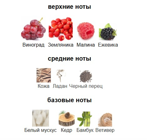 Верхние ноты: Виноград, Земляника, Малина и Ежевика; средние ноты: Кожа, Ладан и Черный перец; базовые ноты: Белый мускус, Кедр, Бамбук и Ветивер.