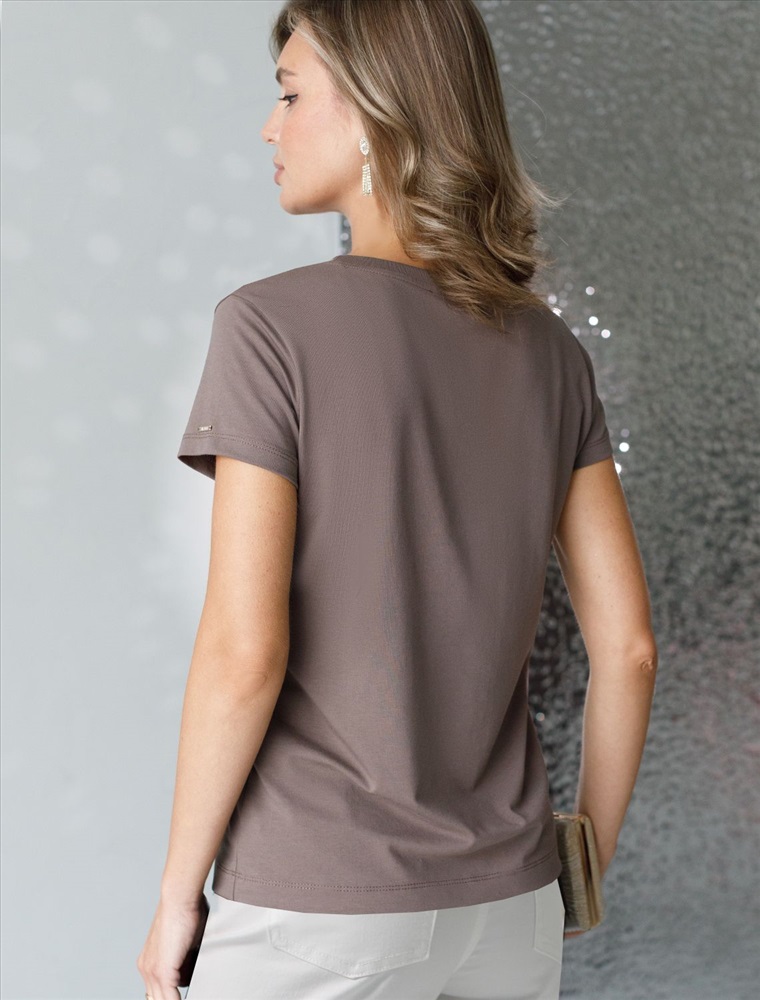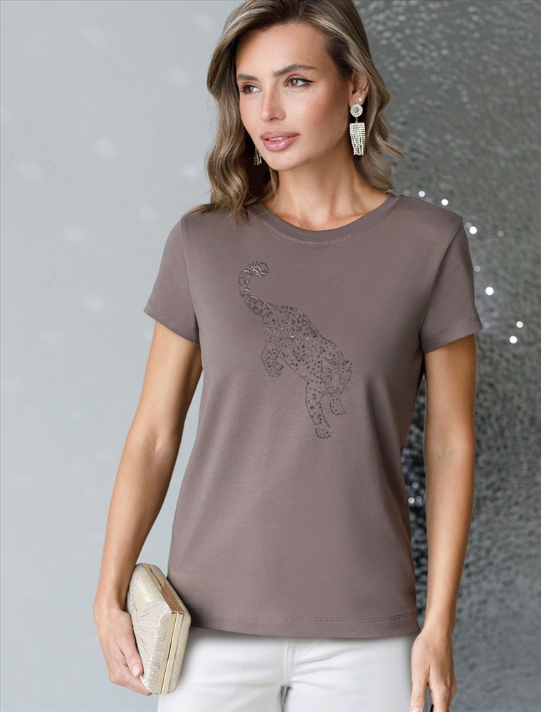 Плотность: 170 Г/м2 Стильная базовая футболка кофейного цвета с серебристым принтом фольгой выполнена из плотного хлопка с эластаном для комфортной посадки на любую фигуру. Прямая футболка классического кроя с круглым вырезом, прекрасно подходит для разных типов фигуры, в том числе и на большие размеры. Мягкость хлопка вместе с небольшой долей эластана гарантирует идеальную посадку и свободу движений. Легкая натуральная дышащая ткань премиального качества делает футболку с коротким рукавом идеальным вариантом для повседневной носки дома, на работу или офис. Однотонная футболка дополнена авторским аккуратным принтом с изображением леопарда, который придает праздничный и элегантный вид без лишней вычурности. Блестящий анималистичный принт аккуратно украшает, добавляя изысканный акцент и создавая легкий мерцающий эффект. Эта эффектная футболка станет отличным выбором на праздник, подчеркивая образ сияющей и уверенной в себе девушки или женщины. Если вы ищете комфортный и одновременно привлекательный наряд для особых моментов, эта футболка станет надежным решением, подчеркивающим вашу индивидуальность и вкус. Комментарии к товару