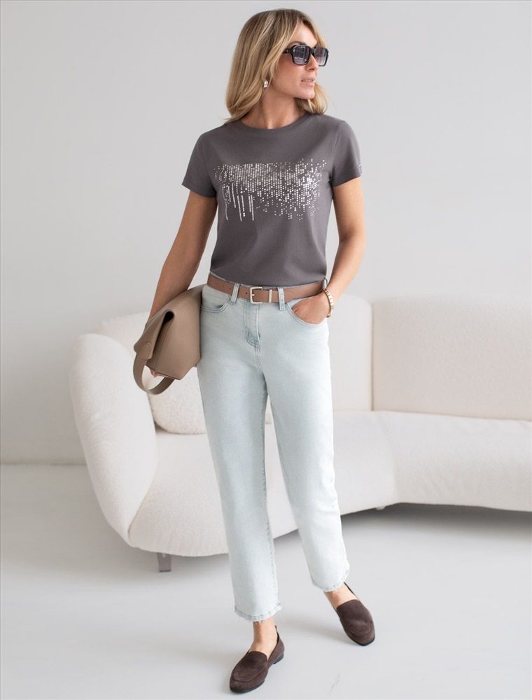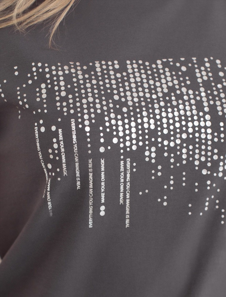 Плотность: 170 Г/м2 Стильная базовая футболка темно-серого цвета с серебристым принтом устойчивами красками выполнена из плотного хлопка с эластаном для комфортной посадки на любую фигуру. Прямая футболка классического кроя с круглым вырезом, прекрасно подходит для разных типов фигуры, в том числе и на большие размеры. Мягкость хлопка вместе с небольшой долей эластана гарантирует идеальную посадку и свободу движений. Легкая натуральная дышащая ткань премиального качества делает футболку с коротким рукавом идеальным вариантом для повседневной носки дома, на работу или офис. Однотонная футболка дополнена авторским аккуратным принтом, который придает праздничный и элегантный вид без лишней вычурности. Блестящий принт в виде дождика аккуратно украшает, добавляя изысканный акцент и создавая легкий мерцающий эффект. Эта эффектная футболка станет отличным выбором на праздник, подчеркивая образ сияющей и уверенной в себе девушки или женщины. Если вы ищете комфортный и одновременно привлекательный наряд для особых моментов, эта футболка станет надежным решением, подчеркивающим вашу индивидуальность и вкус. Комментарии к товару
