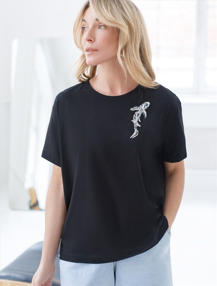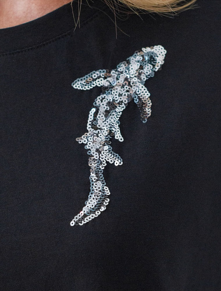 Стильная базовая футболка черного цвета с принтом пайетками в виде рыбки выполнена из плотного хлопка с эластаном для комфортной посадки на любую фигуру. Прямая футболка классического кроя с круглым вырезом, прекрасно подходит для разных типов фигуры, в том числе и на большие размеры. Мягкость хлопка вместе с небольшой долей эластана гарантирует идеальную посадку и свободу движений. Легкая натуральная дышащая ткань премиального качества делает футболку с коротким рукавом идеальным вариантом для повседневной носки дома, на работу или офис. Однотонная футболка дополнена авторским аккуратным принтом, который придает праздничный и элегантный вид без лишней вычурности. Блестящий анималистичный принт аккуратно украшает, добавляя изысканный акцент и создавая легкий мерцающий эффект.