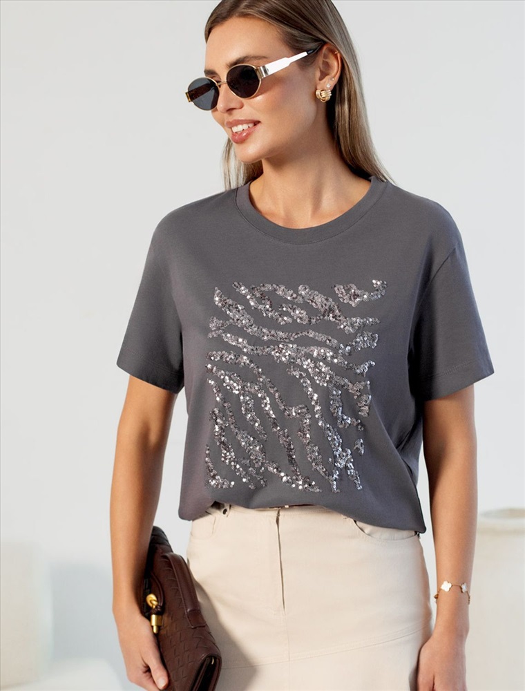 Стильная базовая футболка темно-серого цвета с серебристым принтом пайетками выполнена из плотного хлопка с эластаном для комфортной посадки на любую фигуру. Прямая футболка классического кроя с круглым вырезом, прекрасно подходит для разных типов фигуры, в том числе и на большие размеры. Мягкость хлопка вместе с небольшой долей эластана гарантирует идеальную посадку и свободу движений. Легкая натуральная дышащая ткань премиального качества делает футболку с коротким рукавом идеальным вариантом для повседневной носки дома, на работу или офис. Однотонная футболка дополнена авторским аккуратным принтом зебра, который придает праздничный и элегантный вид без лишней вычурности. Блестящий анималистичный принт аккуратно украшает, добавляя изысканный акцент и создавая легкий мерцающий эффект.