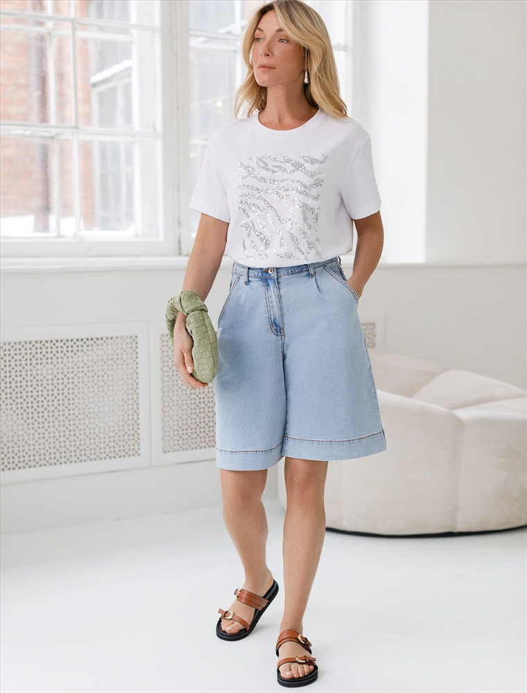 Стильная базовая футболка белого цвета с серебристым принтом пайетками выполнена из плотного хлопка с эластаном для комфортной посадки на любую фигуру. Прямая футболка классического кроя с круглым вырезом, прекрасно подходит для разных типов фигуры, в том числе и на большие размеры. Мягкость хлопка вместе с небольшой долей эластана гарантирует идеальную посадку и свободу движений. Легкая натуральная дышащая ткань премиального качества делает футболку с коротким рукавом идеальным вариантом для повседневной носки дома, на работу или офис. Однотонная футболка дополнена авторским аккуратным принтом зебра, который придает праздничный и элегантный вид без лишней вычурности. Блестящий анималистичный принт аккуратно украшает, добавляя изысканный акцент и создавая легкий мерцающий эффект.