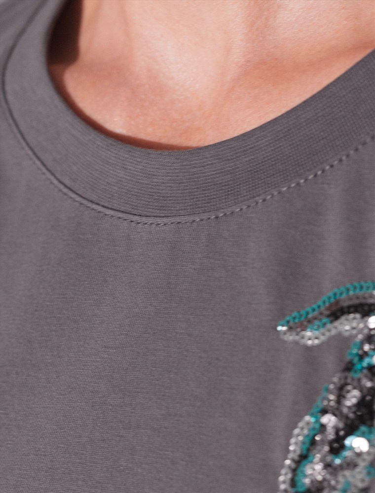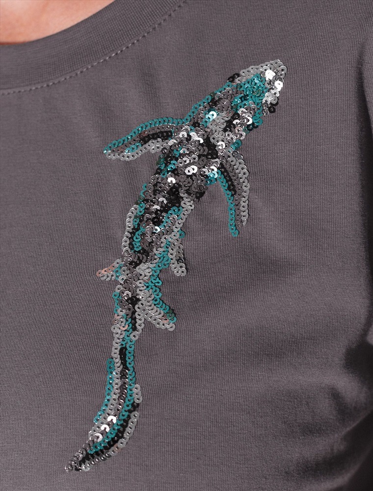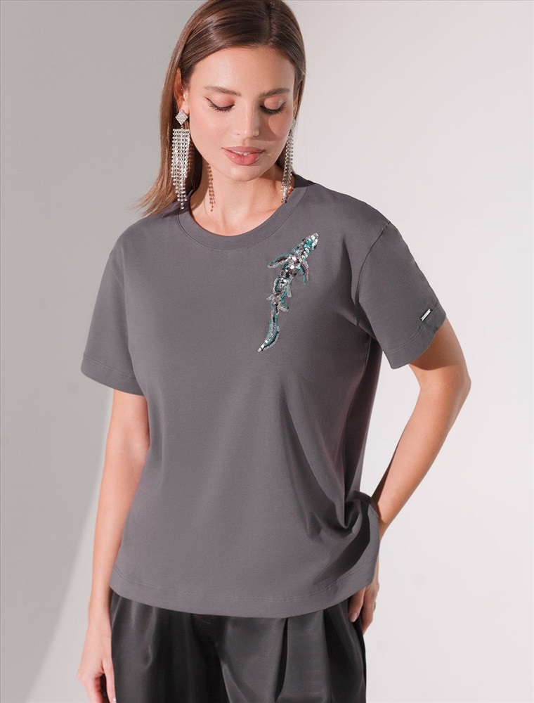 Плотность: 170 Г/м2 Стильная базовая футболка темно-серого цвета с принтом пайетками в виде рыбки выполнена из плотного хлопка с эластаном для комфортной посадки на любую фигуру. Прямая футболка классического кроя с круглым вырезом, прекрасно подходит для разных типов фигуры, в том числе и на большие размеры. Мягкость хлопка вместе с небольшой долей эластана гарантирует идеальную посадку и свободу движений. Легкая натуральная дышащая ткань премиального качества делает футболку с коротким рукавом идеальным вариантом для повседневной носки дома, на работу или офис. Однотонная футболка дополнена авторским аккуратным принтом зебра, который придает праздничный и элегантный вид без лишней вычурности. Блестящий анималистичный принт аккуратно украшает, добавляя изысканный акцент и создавая легкий мерцающий эффект. Эта эффектная футболка станет отличным выбором на праздник, подчеркивая образ сияющей и уверенной в себе девушки или женщины. Если вы ищете комфортный и одновременно привлекательный наряд для особых моментов, эта футболка станет надежным решением, подчеркивающим вашу индивидуальность и вкус. Комментарии к товару