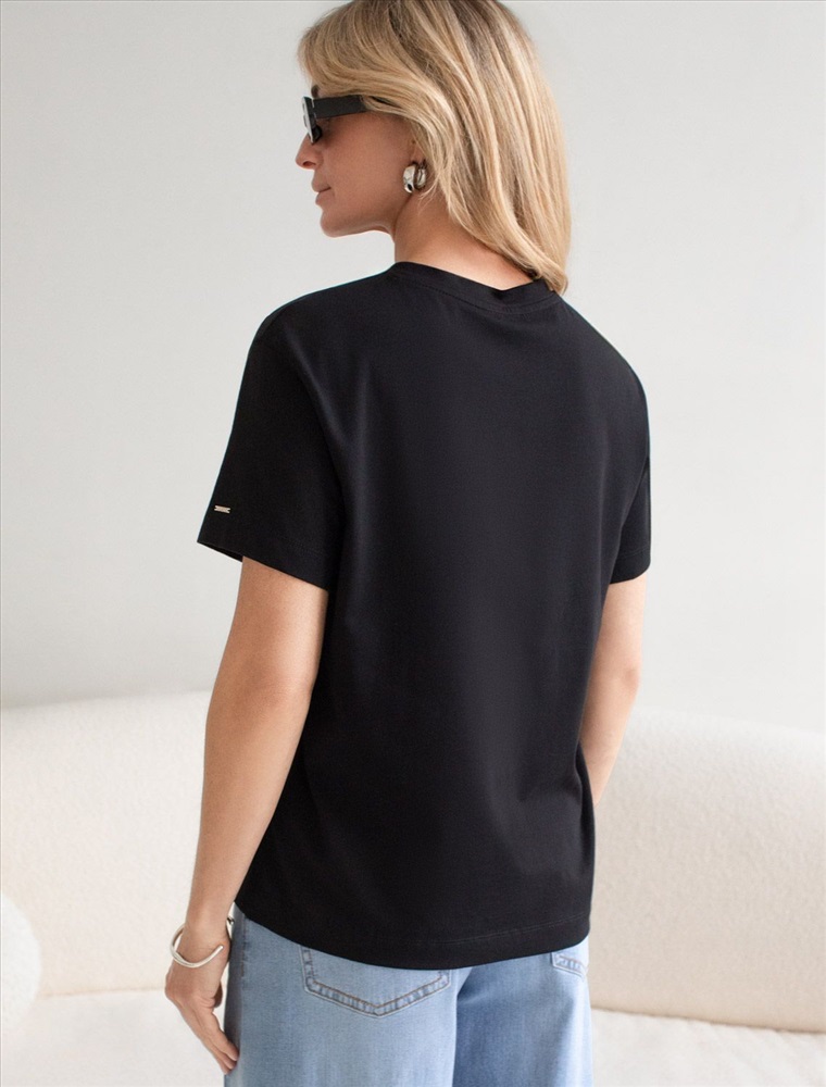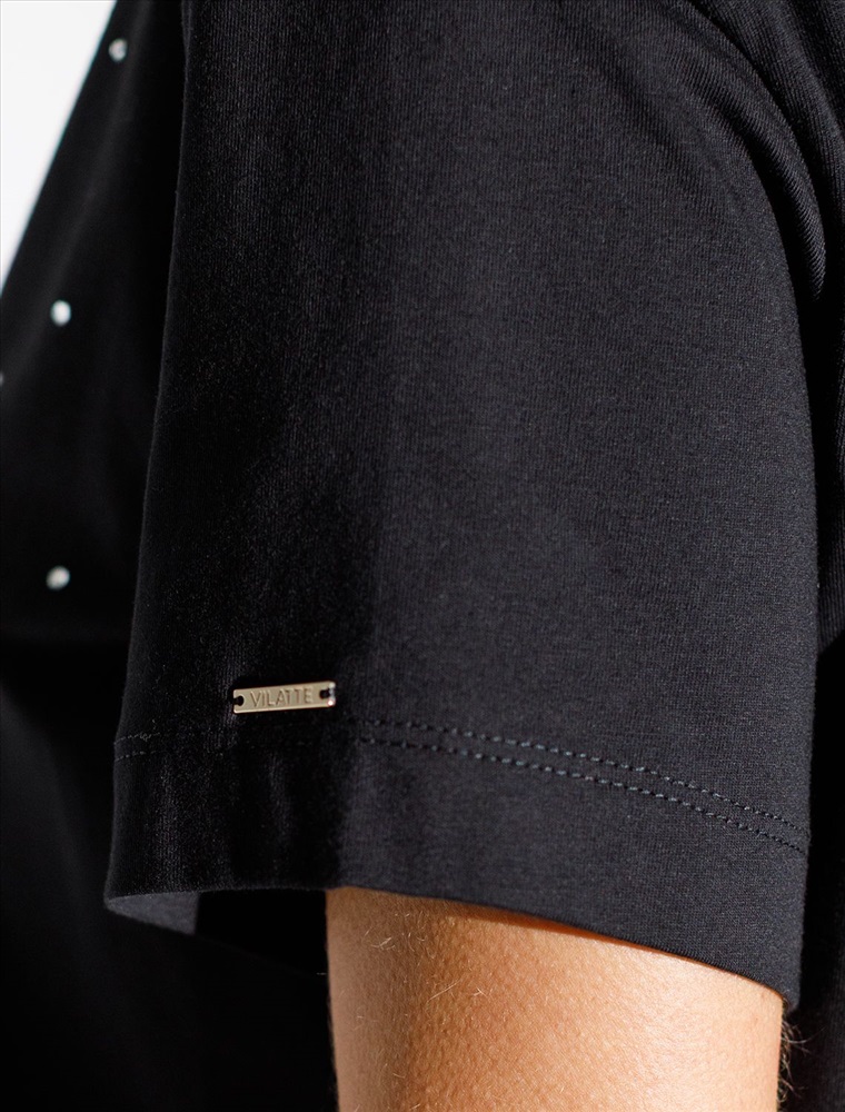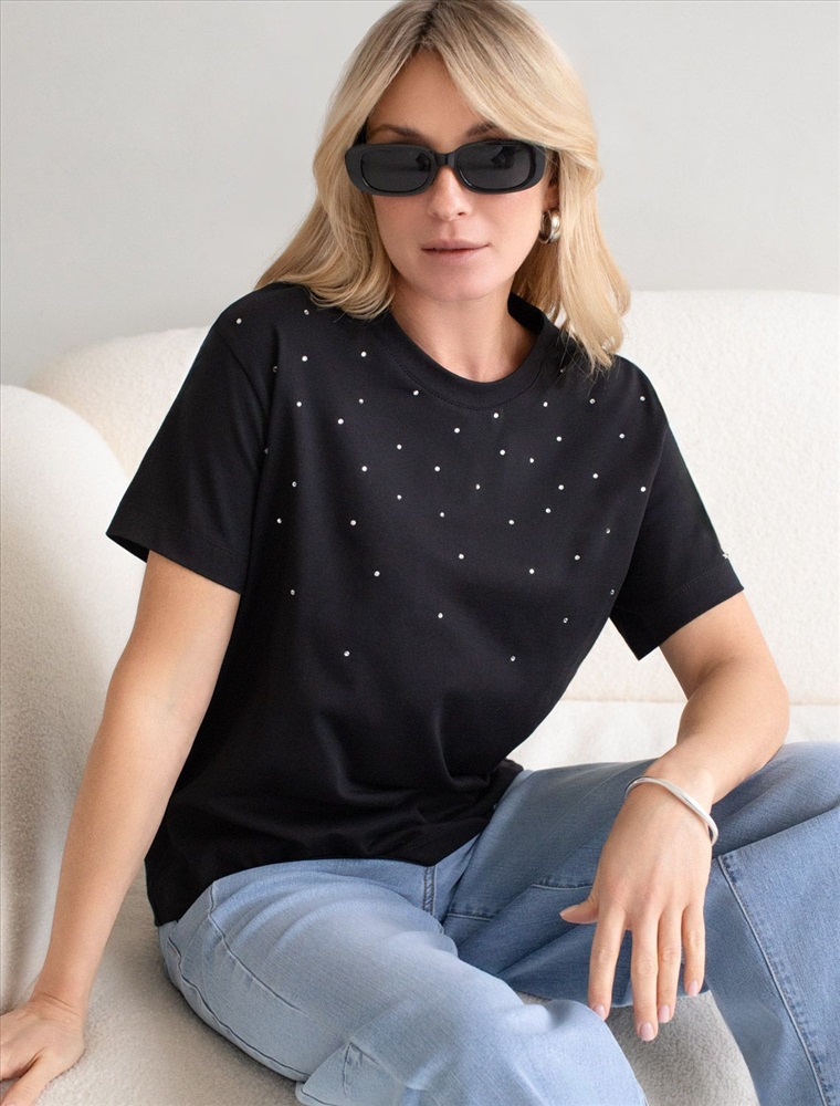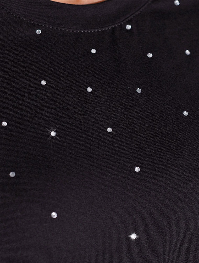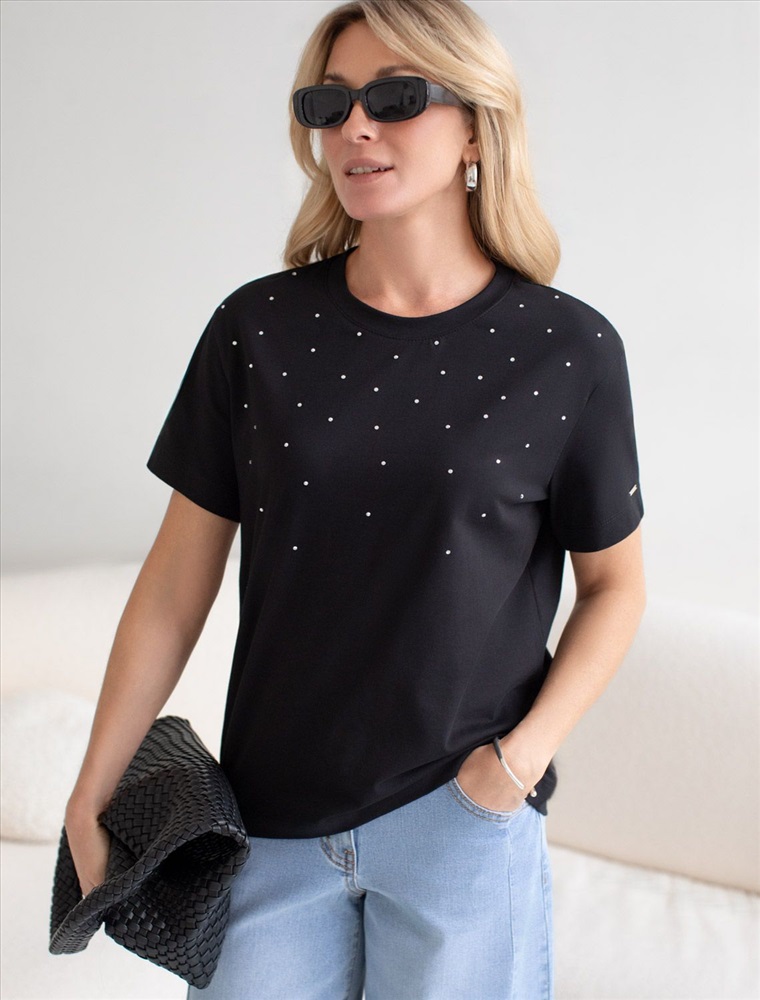 Плотность: 170 Г/м2 Стильная базовая футболка черного цвета с принтом стразами выполнена из плотного хлопка с эластаном для комфортной посадки на любую фигуру. Прямая футболка классического кроя с круглым вырезом, прекрасно подходит для разных типов фигуры, в том числе и на большие размеры. Мягкость хлопка вместе с небольшой долей эластана гарантирует идеальную посадку и свободу движений. Легкая натуральная дышащая ткань премиального качества делает футболку с коротким рукавом идеальным вариантом для повседневной носки дома, на работу или офис. Однотонная футболка дополнена авторским аккуратным принтом, который придает праздничный и элегантный вид без лишней вычурности. Блестящий принт в виде россыпи страз аккуратно украшает, добавляя изысканный акцент и создавая легкий мерцающий эффект. Эта эффектная футболка станет отличным выбором на праздник, подчеркивая образ сияющей и уверенной в себе девушки или женщины. Если вы ищете комфортный и одновременно привлекательный наряд для особых моментов, эта футболка станет надежным решением, подчеркивающим вашу индивидуальность и вкус. Комментарии к товару