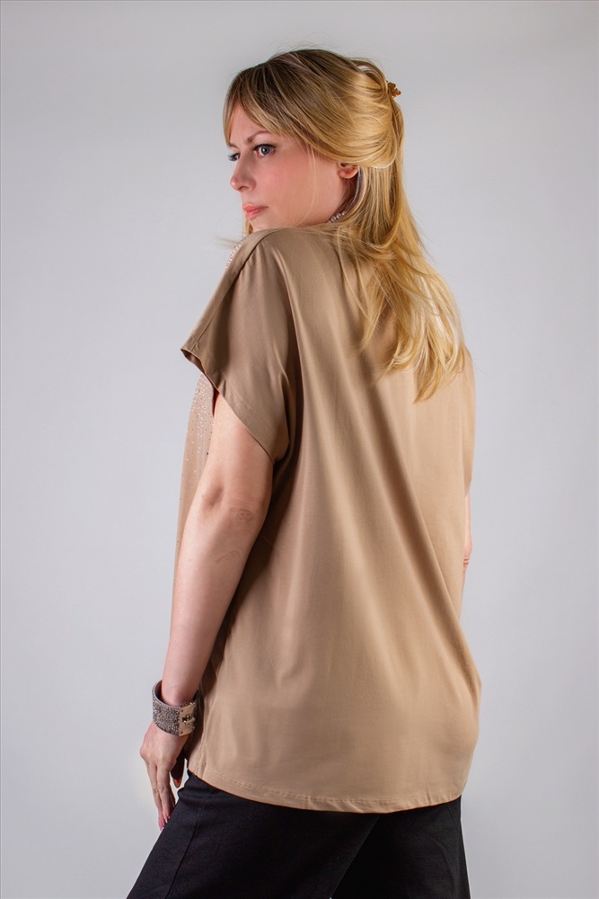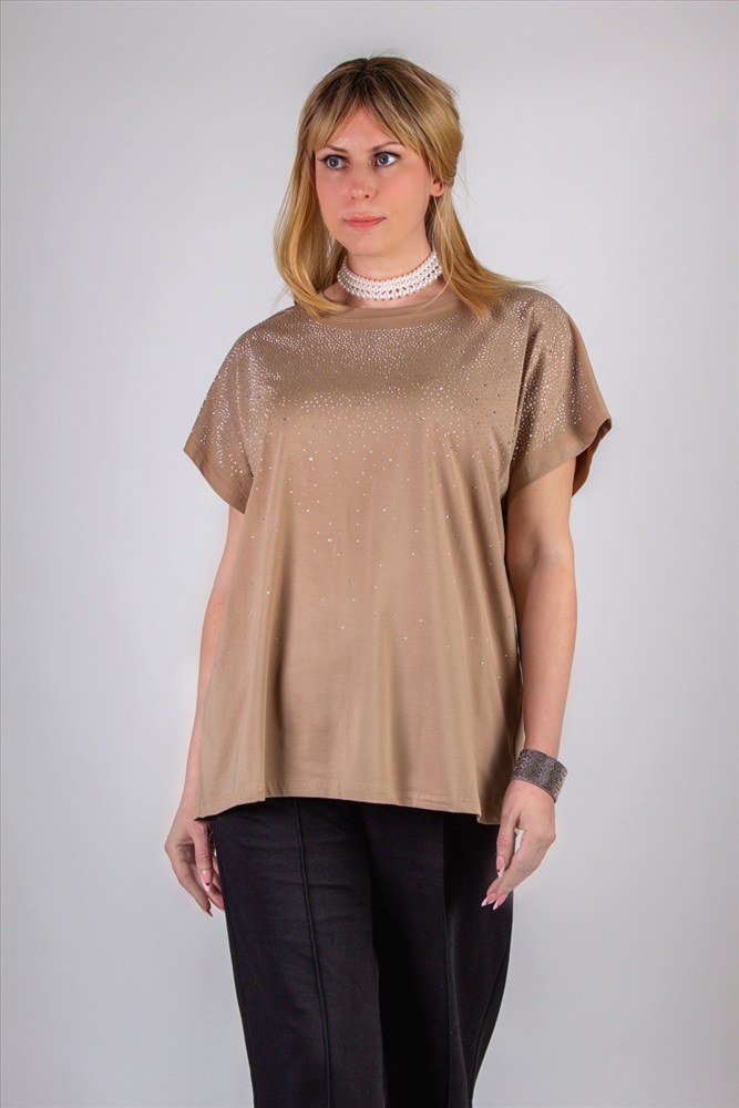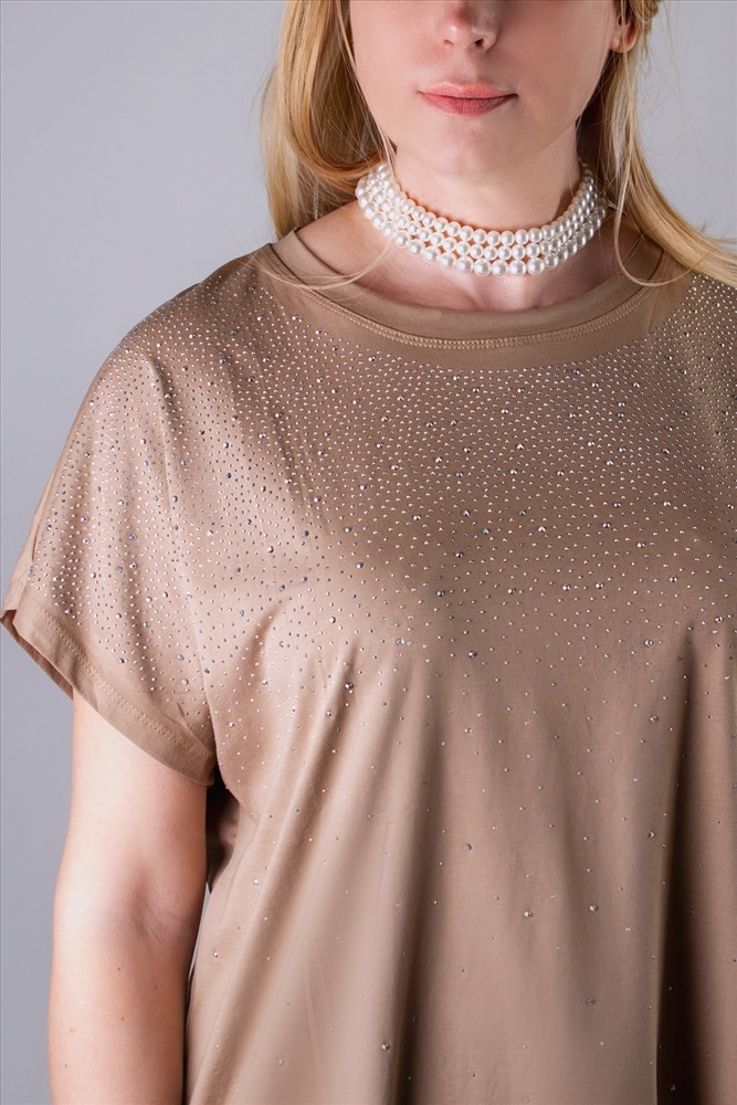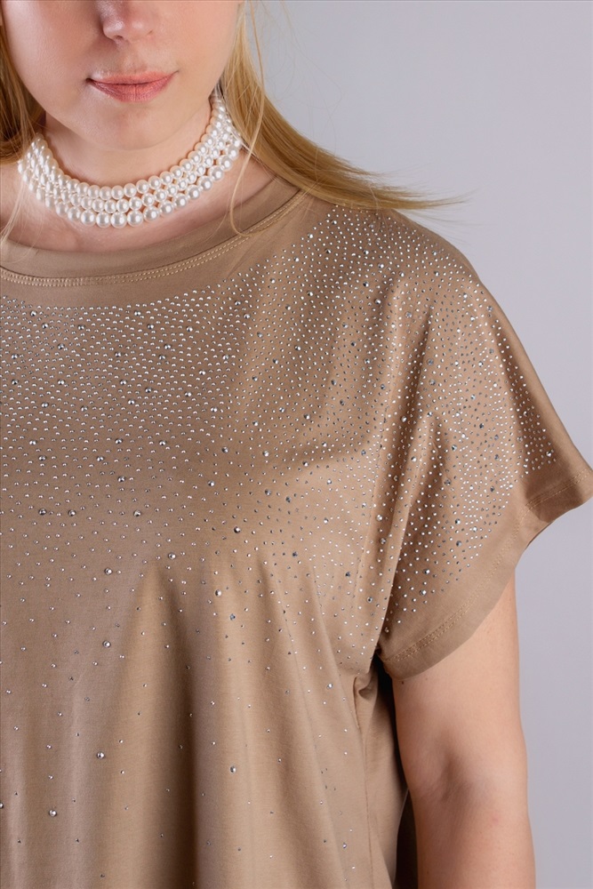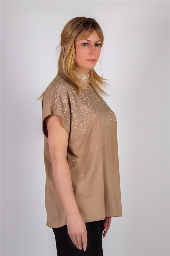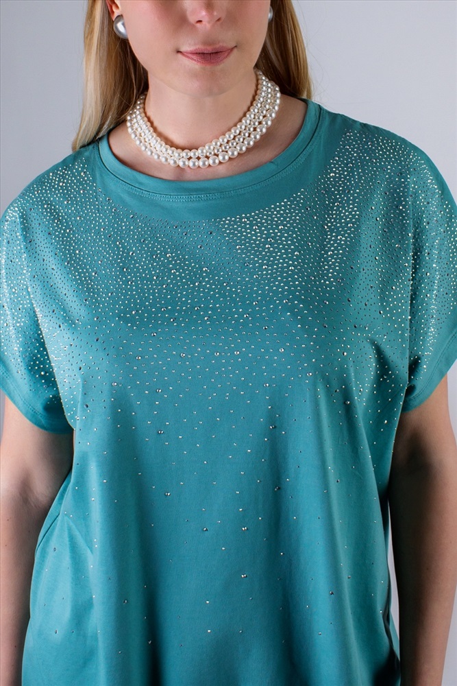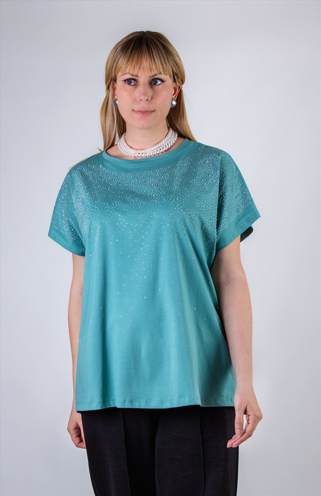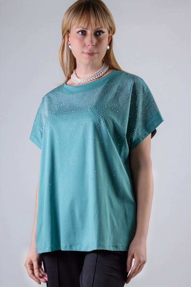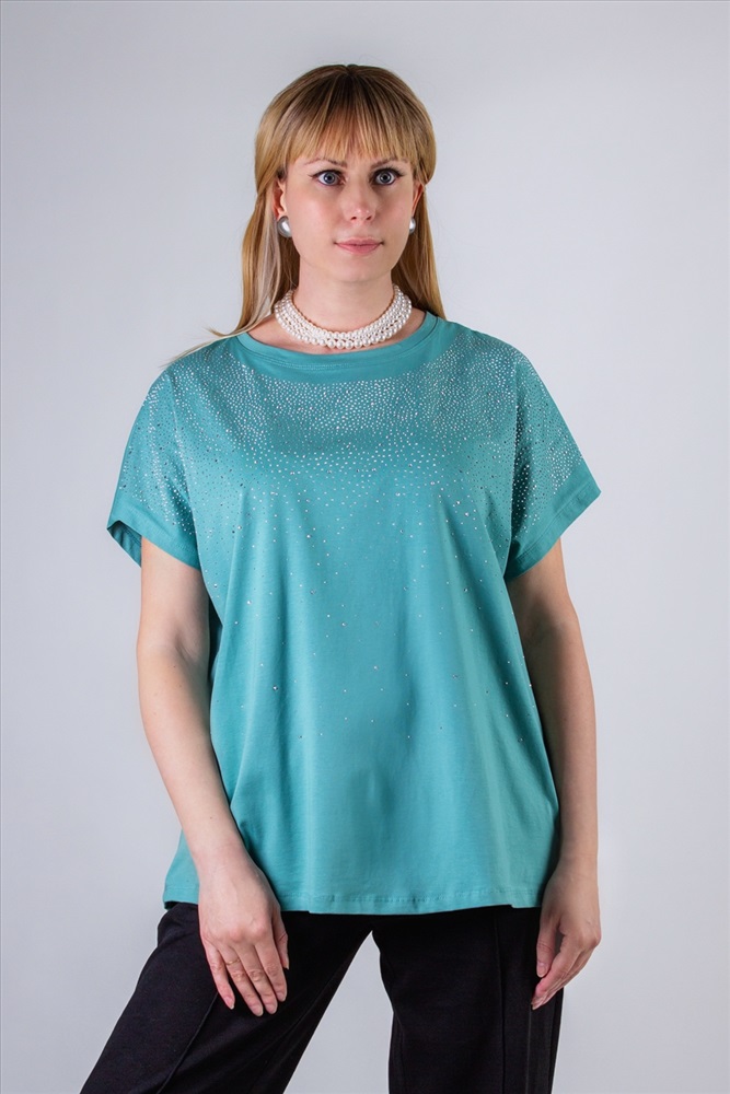 Стиль: нарядный | повседневный Нарядная футболка плотная со стразами, арт.6167 - универсальная футболка, сочетающая в себе комфорт базового кроя и изящную россыпь из страз. Изготовленная из плотного, но при этом мягкого и дышащего материала 95 % коттон и 5 % полиэстера она гарантирует идеальную посадку и сохраняет форму даже после многократных стирок. Такой состав делает изделие износостойким, упругим и приятным к телу: вы забудете о дискомфорте, а эластичные волокна не позволят ткани растянуться или подсесть после стирки. Крой футболки продуман до мелочей: опущенная линия плеча создают свободный, но элегантный силуэт, который легко адаптируется под любую фигуру. Единый размер 4656 идеально садится благодаря продуманному объёму, подчёркивая достоинства и скрывая возможные недостатки. Главная особенность модели россыпь прозрачных страз, размещённых в технике градиента: у горловины они располагаются более плотно, а к линии талии их количество постепенно уменьшается. Под утренним дневным и вечернем светом камушки переливаются по разному, и особенно эффектно при солнечном свете, добавляя образу изысканности и визуальной лёгкости. Такой декор отлично впишется в повседневные ансамбли и придаст праздничности вечерним выходам, при этом оставаясь ненавязчивым. Все стразы закреплены с особой прочностью, поэтому при соблюдении рекомендаций по уходу они не теряют блеска и не осыпаются, позволяя наслаждаться эффектным гранж-гламуром днем и вечером. Футболка предлагается в двух актуальных оттенках благородном бежевом и свежем бирюзовом. Нейтральный беж позволит создать мягкий, монохромный образ в духе минимализма, а бирюза оживит ансамбль и добавит мягкий акцент. Обе расцветки легко комбинируются с джинсами, брюками-карго, шортами и юбками различных фактур: от лёгкого денима до струящейся вискозы. Этот предмет гардероба станет вашим универсальным спутником на каждый день: отправляясь на деловую встречу, вы дополняете образ строгим пиджаком и брюками, а для прогулки по городу надеваете кеды и джинсы. При этом уникальный декор стразами украсит даже самый сдержанный лук, придав ему нотку гламура и индивидуальности. Уход за изделием не потребует специальных усилий: деликатная стирка при температуре до 30 C на щадящем режиме и отжим до 800 об/мин и футболка снова готова к выходу. Избегайте отбеливателей и агрессивных пятновыводителей, а для сохранения блеска стразов лучше выворачивать вещь наизнанку перед стиркой. Эта модель идеальное решение для тех, кто ценит сочетание практичности и утончённого декора. Благодаря продуманному крою, качественным материалам и оригинальным деталям она органично впишется в любой стиль и порадует вас комфортом долгие сезоны. На фото модель представлена в трикотажных брюках со стрелкой (арт. 870-8) Следует отметить что чем больше Ваш размер, тем менее будет выражен эффект оверсайз. Рост модели на фото: 168 см, размер: 46-48, на ней футболка единого 46-56 размера.