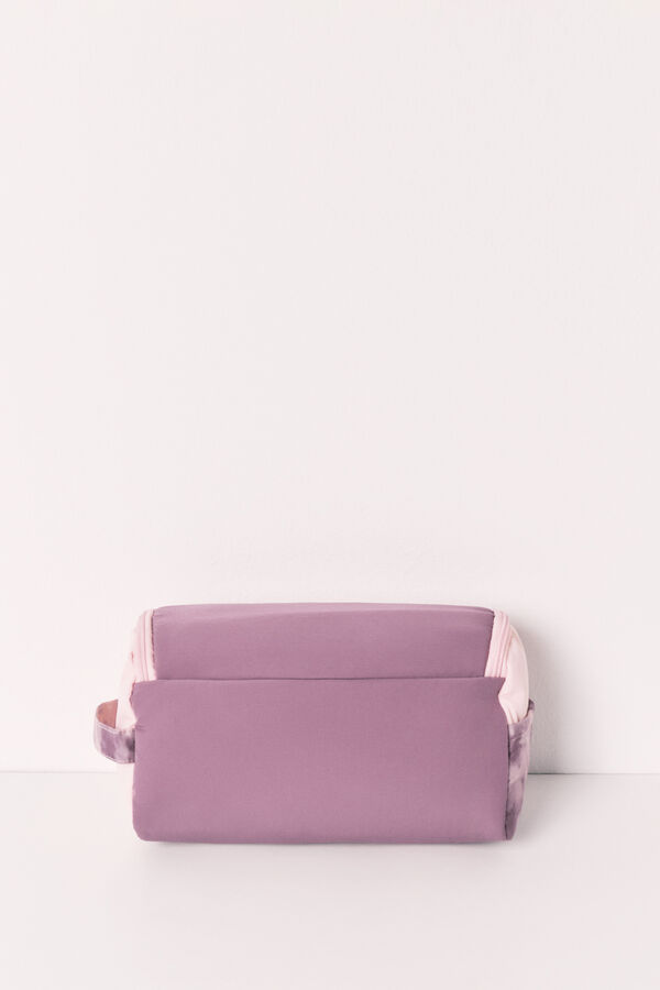 Neceser grande de nylon acolchado, en color morado y rosa, con divertido detalle de Snoopy. Perfecto para llevar contigo todos tus básicos beauty, ideal para fans nostálgicas de la famosa mascota. Medidas: 16 cmx 27 cm x 14 cm.
