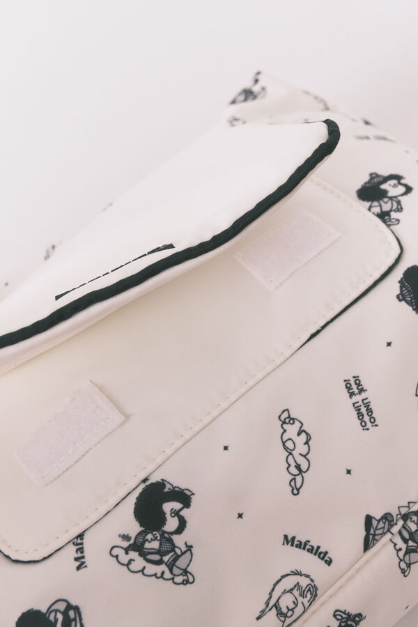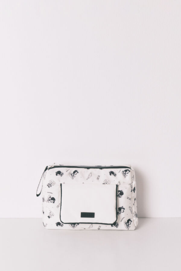 Neceser grande en color blanco con bolsillo frontal y estampado de Mafalda. Fabricado en nylon resistente. Ligero y práctico para organizar tus básicos. Medidas: 20x29x13 cm.