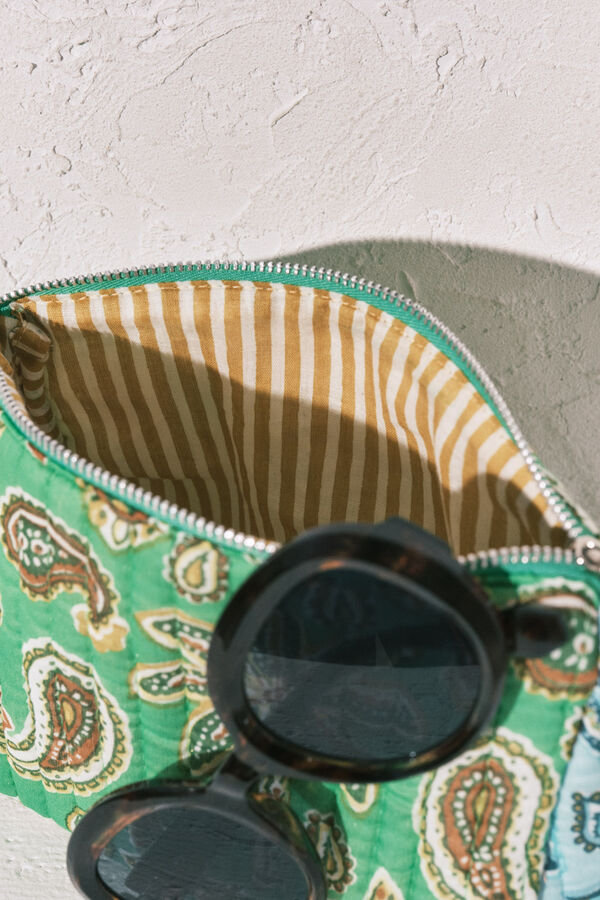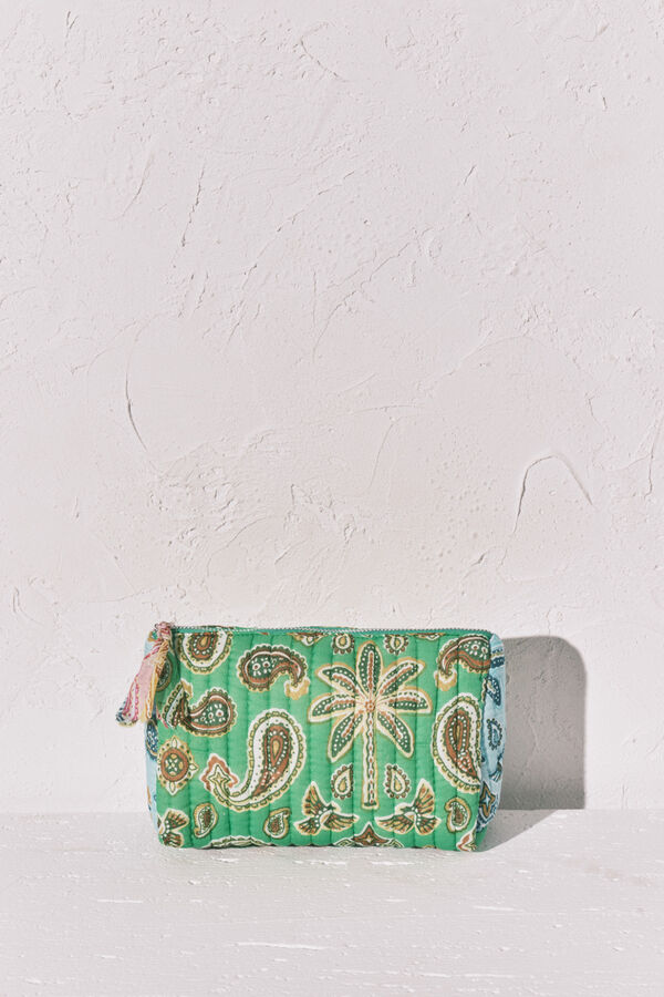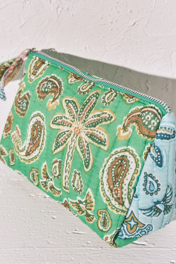 Neceser mediano en tejido de algodón con efecto guateado y estampado tipo pañuelo de flores multicolor. Con cremallera en metal y tirador con tejidos multicolor. Con el tamaño ideal para llevar contigo tus básicos de playa o piscina.