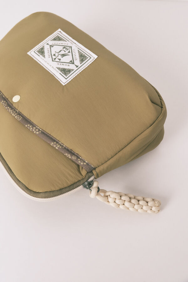 Neceser mediano tipo estuche con cremallera, de color verde con vivo de florecitas. Perfecto para llevar contigo tus básicos beauty, de viaje o en el bolso a diario. Medidas: 18x26x6 cm.