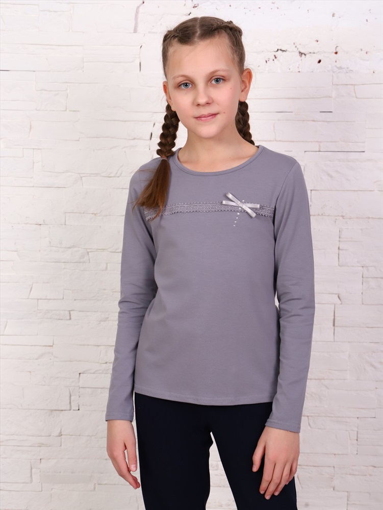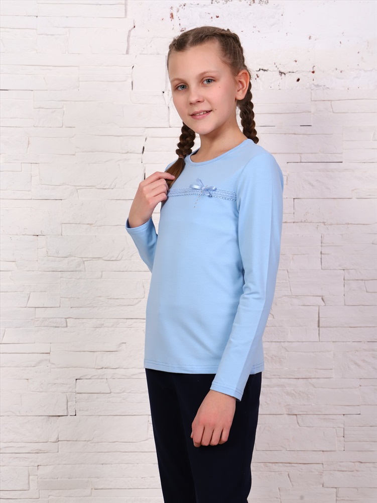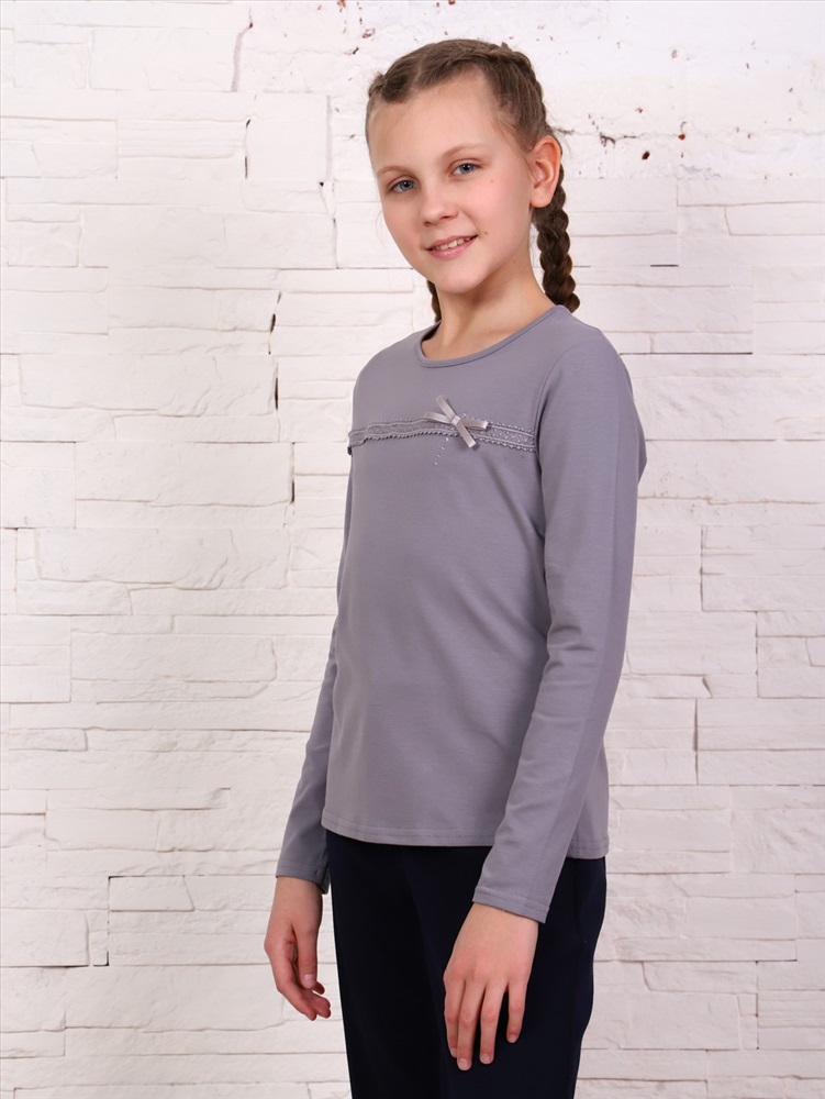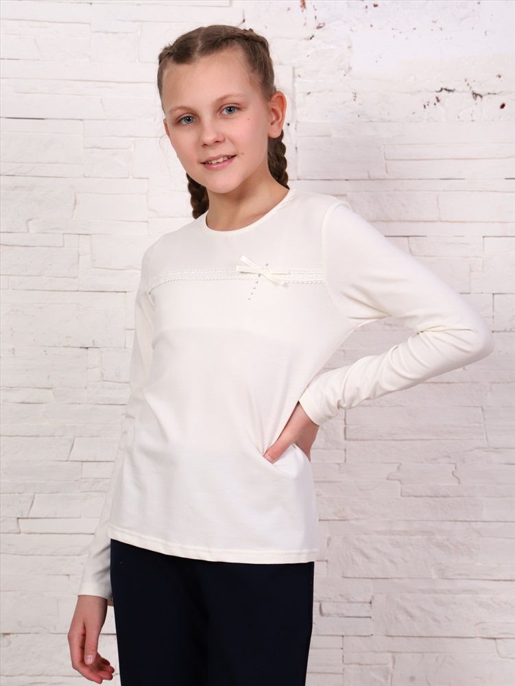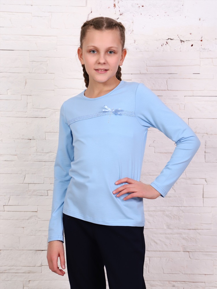 Застежка: без застежки Блузка для девочек младшего и старшего школьного возраста, из однотонного трикотажного полотна. Блузка прилегающего силуэта, с втачным рукавом. Спереди и на спинке отсутствуют линии членения. Рукава длинные. Низа рукавов и изделия подогнуты. Горловина окантована. Спереди по линии груди настрочено кружево и прикреплен декоративный элемент из страз и атласной ленты.