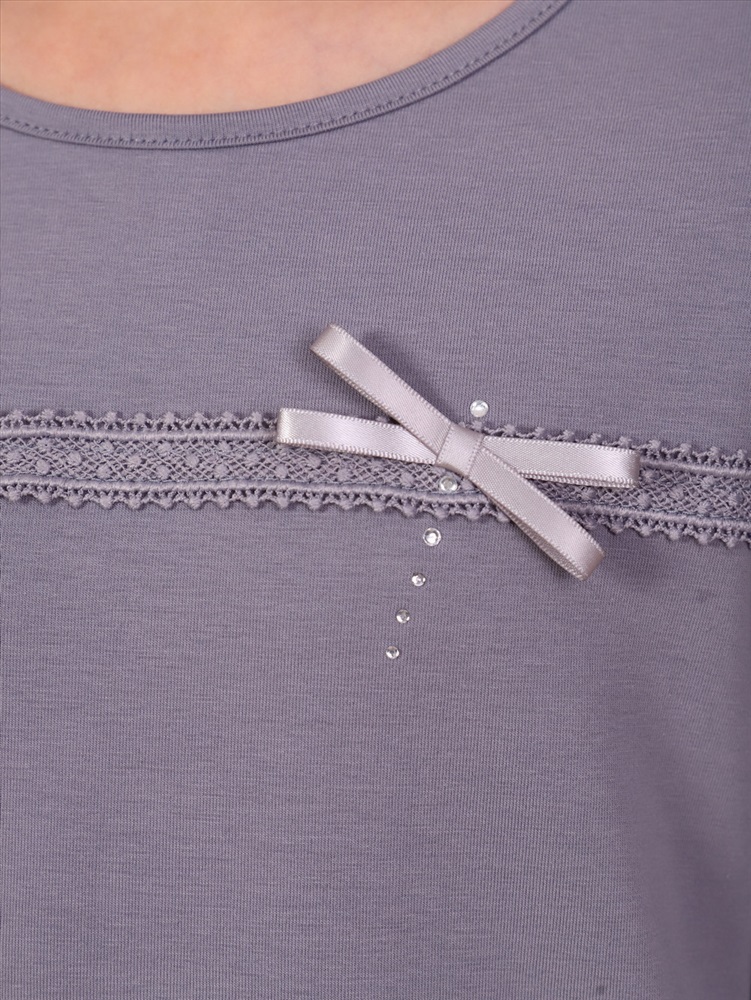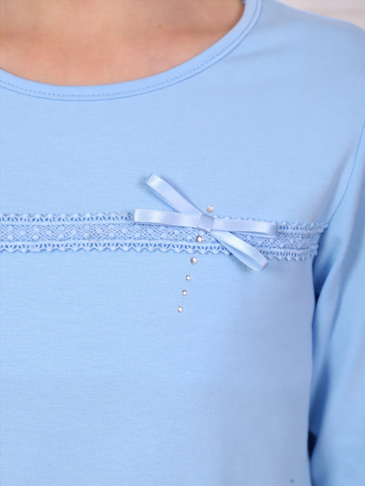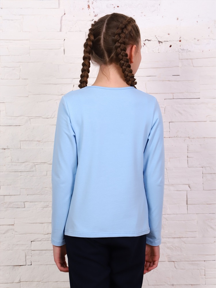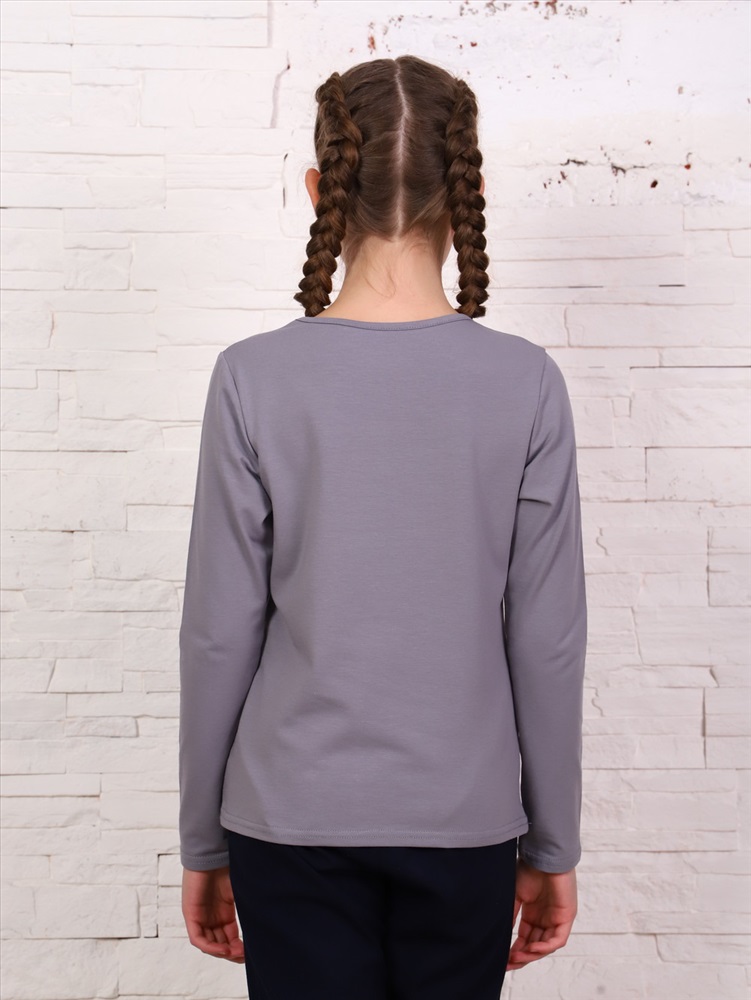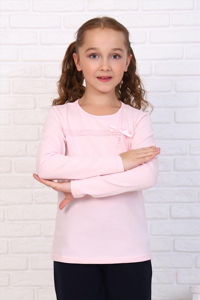 Застежка: без застежки Блузка для девочек младшего и старшего школьного возраста, из однотонного трикотажного полотна. Блузка прилегающего силуэта, с втачным рукавом. Спереди и на спинке отсутствуют линии членения. Рукава длинные. Низа рукавов и изделия подогнуты. Горловина окантована. Спереди по линии груди настрочено кружево и прикреплен декоративный элемент из страз и атласной ленты.