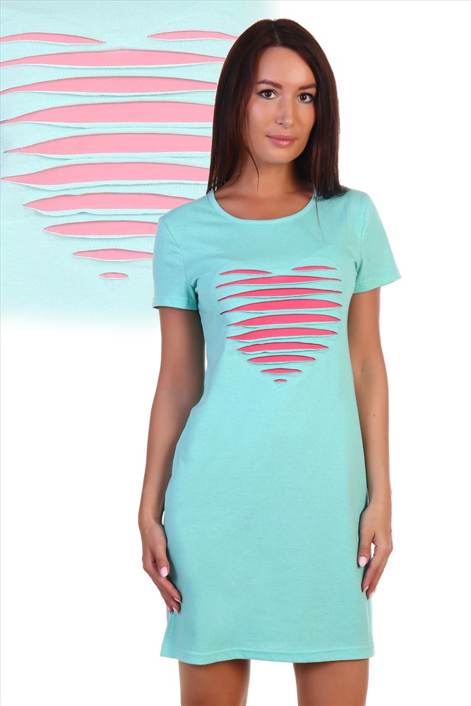 Стиль: домашний Сорочка из кулирки. Рукава короткие, общая длина до середины бедра. На груди стилизованное изображение сердца из разрезов