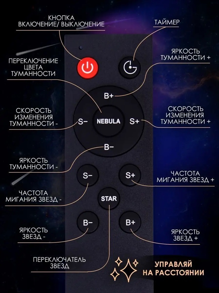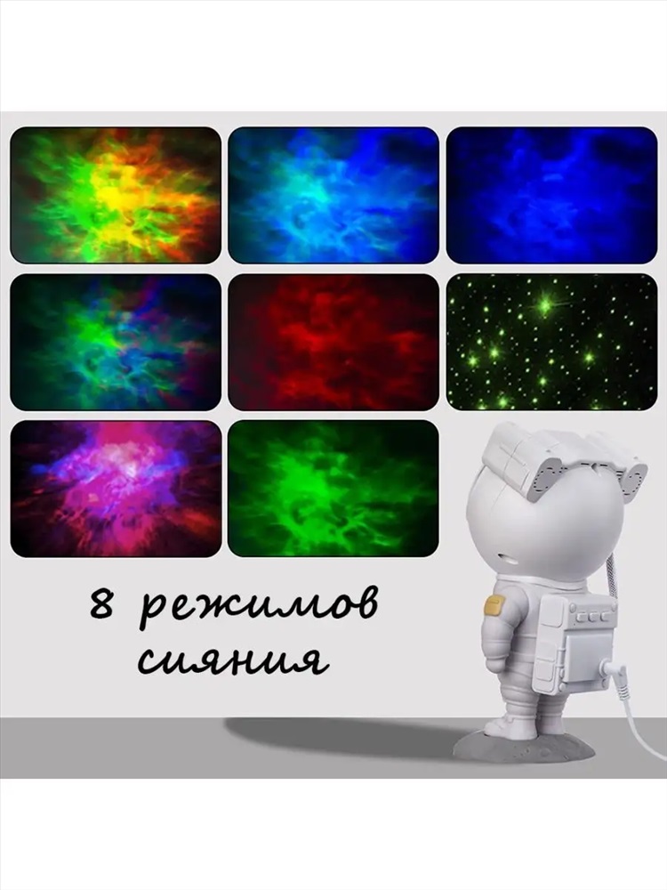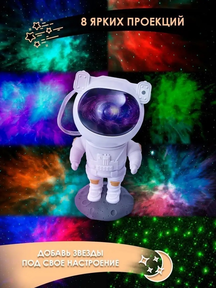 Бренд: Натали Суслова Настольный ночник космонавт звездное небо - это целый планетарий внутри вашего дома: гостиной, прихожей или детской комнаты. С помощью светодиодного прожектора можно создать собственную вселенную меняя цвета туманности. Управляя светящимся космонавтом как с кнопок на самом устройстве, так и с пульта дистанционного управления вы сможете украсить любой праздник, устроить диско вечеринку, создать благоприятную атмосферу для сна ребёнка, так как освещающий спальню проектор абсолютно без шума, а можно даже отдохнуть и расслабиться после тяжёлого рабочего дня, включив музыку и легкое свечение ночника. Этот невероятно гипнотизирующий проектор можно взять в подарок на любой праздник!