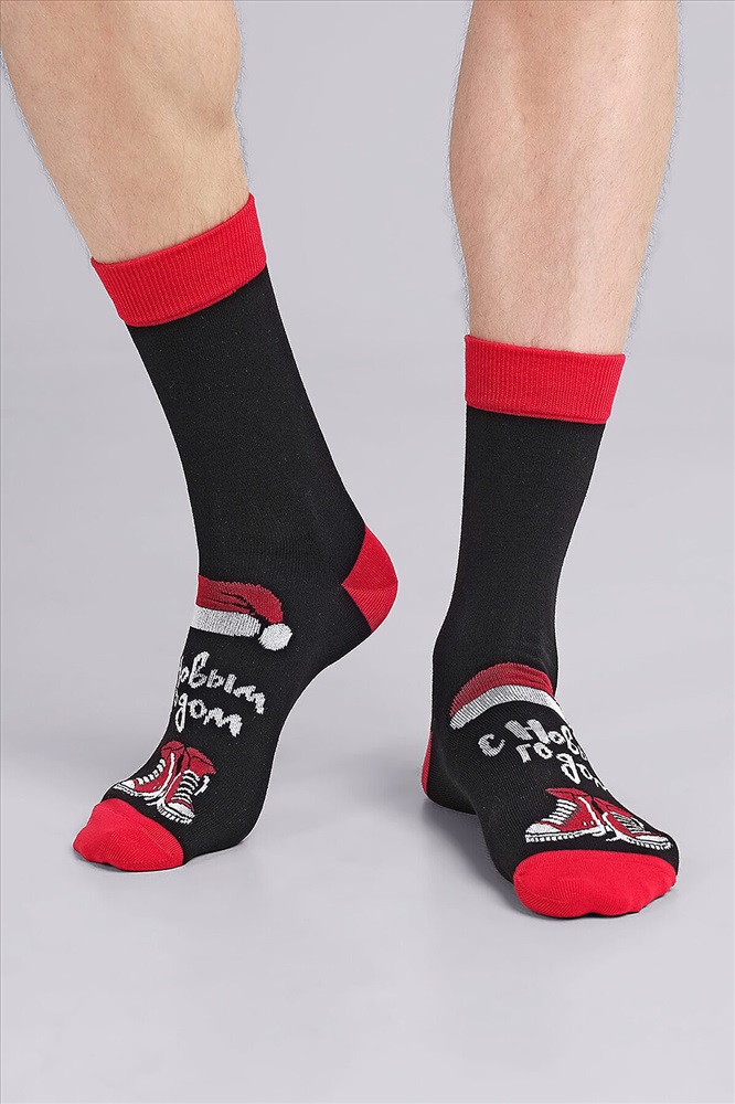 ID товара: 1060966 Состав: 70% Хлопок, 25% Полиамид, 5% Эластан Сезон: Осень/Зима Рисунок: Фантазийный Основная ткань: Хлопок Вид носков/гольф: Фантазийные Страна бренда: Россия Страна производства: Россия Мужские новогодние носки с рисунком, с надписью С НОВЫМ ГОДОМ Комментарии к товару