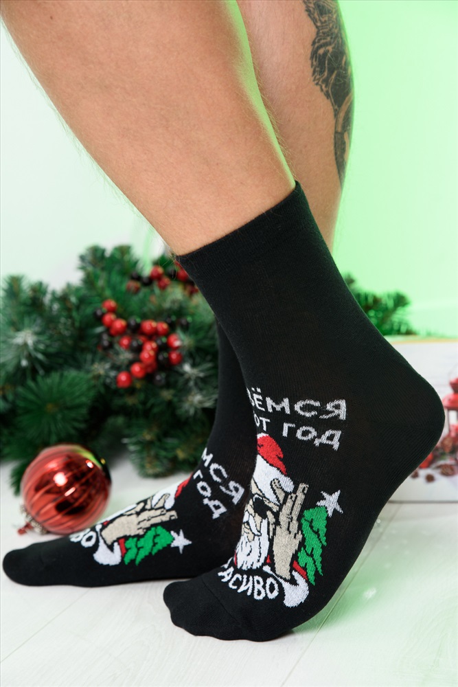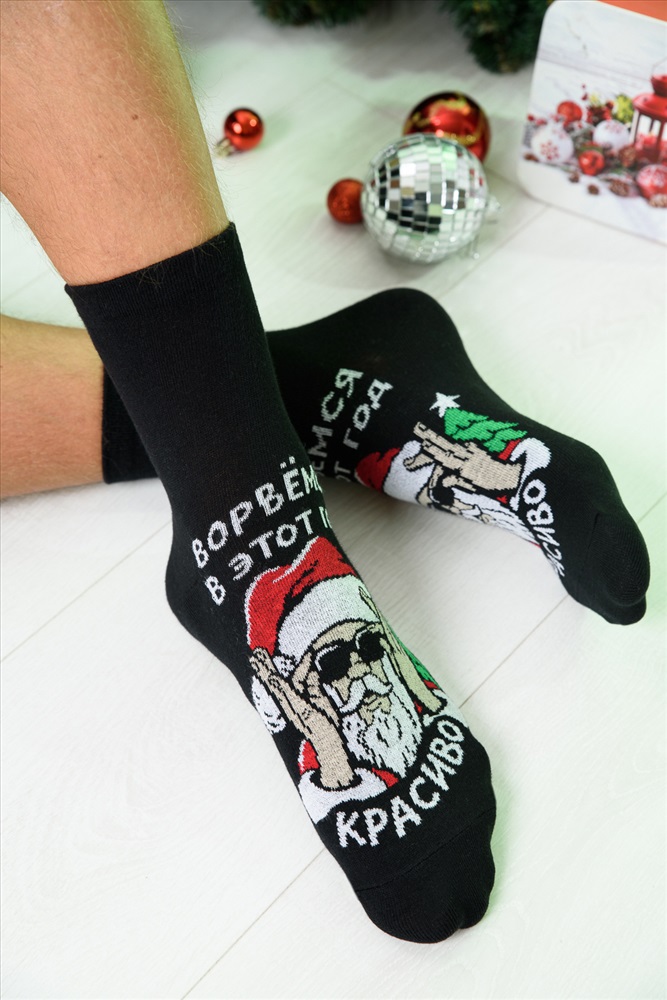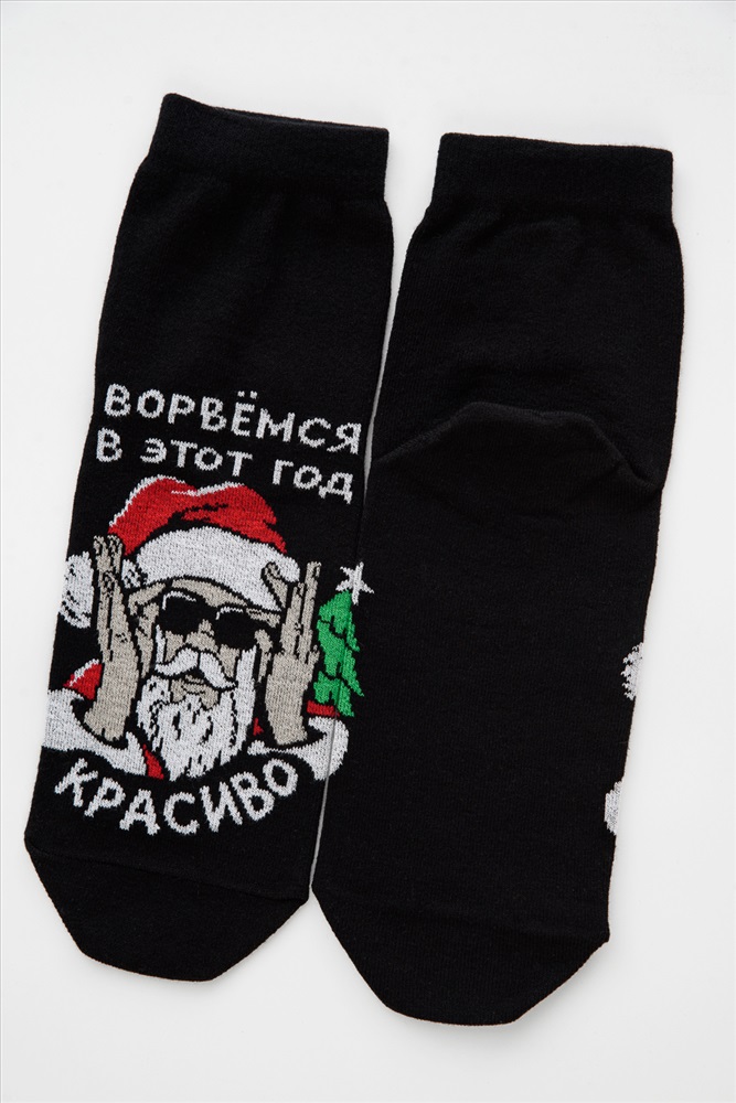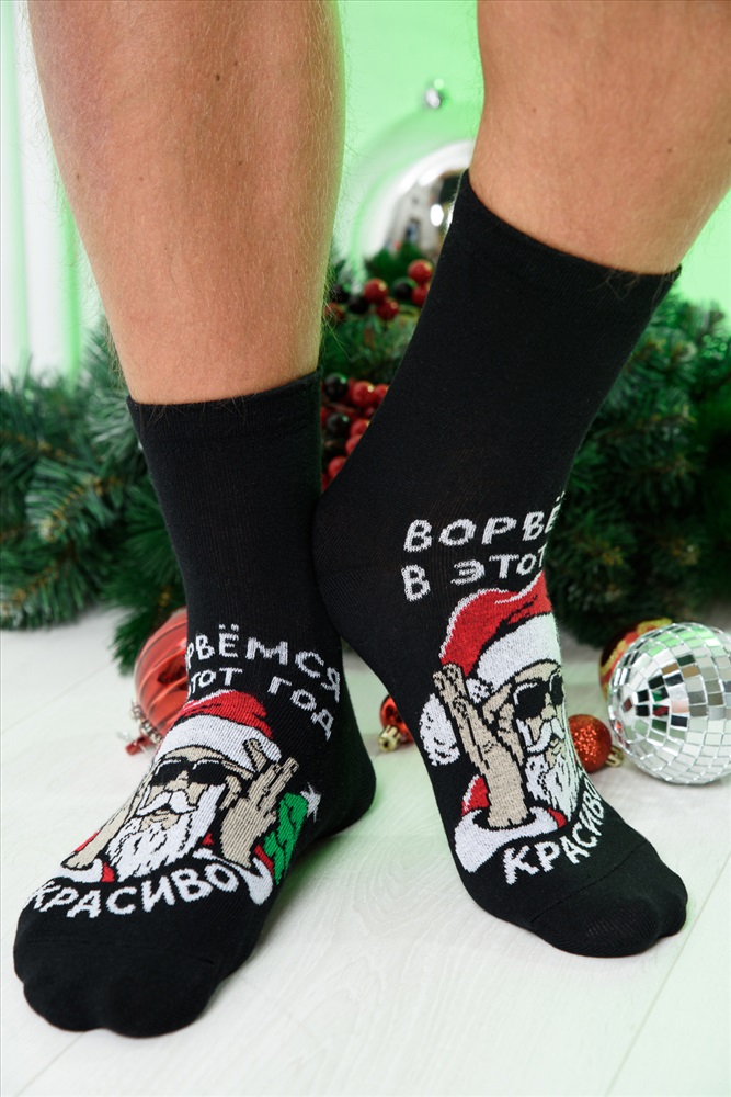 Стиль: домашний | повседневный Оригинальные мужские новогодние носки. В комплекте 1 пара. На основной части носка изображение Санта Клауса и надпись Ворвемся в этот год красимо.