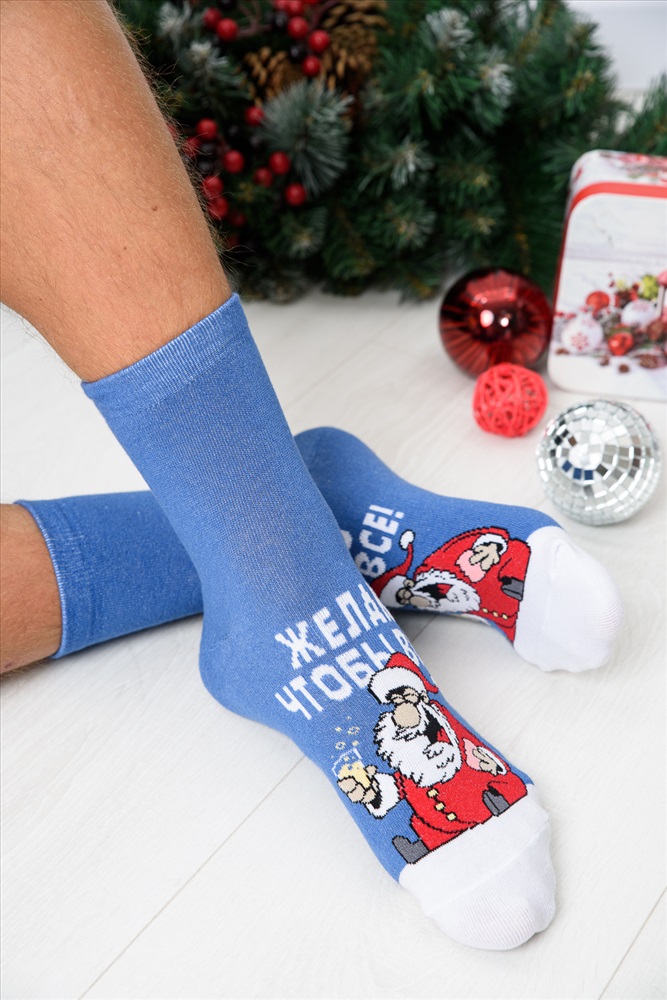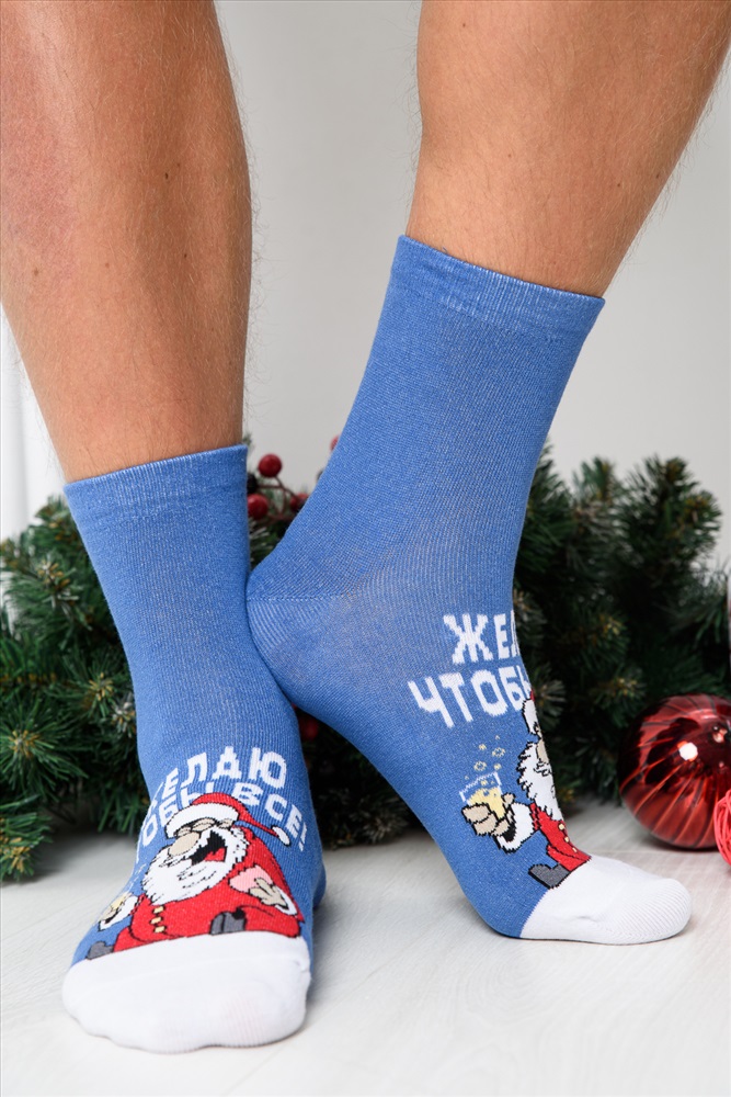 Стиль: повседневный Оригинальные мужские новогодние носки. В комплекте 1 пара. На основной части носка изображение Санта Клауса и надпись Желаю чтобы все. Оригинальная расцветка делает носки отличный подарком на Новый год.