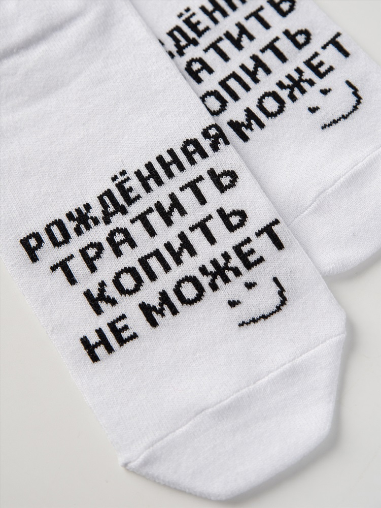 Сезонность: лето | осень | весна | зима Добавь стиля каждому дню! Выбери носки для тех, кто знает: жизнь одна, а удовольствие в каждой покупке! Яркий принт Рождённая тратить, копить не может поднимет настроение тебе и всем вокруг. Мягкий хлопок, отличная посадка, долговечность и нескучный дизайн именно то, что нужно для максимального комфорта и самовыражения. Стань королевой шопинга и любви к себе, начиная с мелочей! Порадуй себя или подругу твои идеальные носки ждут тебя!