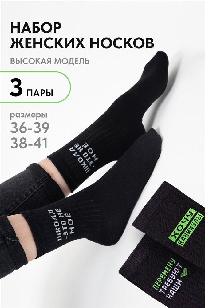 Состав: 73% х/б 22% ПА 3% ПП 2% эластан Модель: Носки женские Учёба (набор 3 пары) Тип товара: носки высокие Материал: чулочно-носочный трикотаж | чулочно-носочный трикотаж Бренд: Amichevole Berchelli НДС: 22% Рейтинг: Рейтинг 4 и выше Рисунок: надпись Стиль: для школы | повседневный Набор женских носков с оригинальными надписями. В упаковке 3 пары - по 1 паре каждого вида Таблица размеров и веса