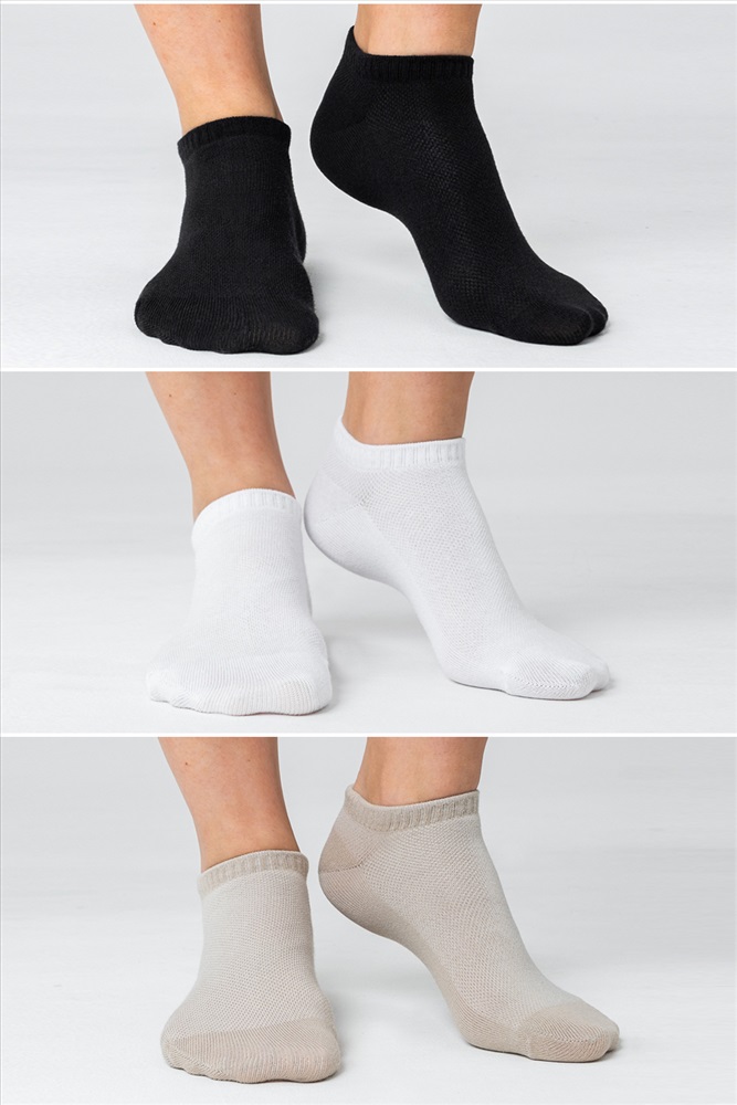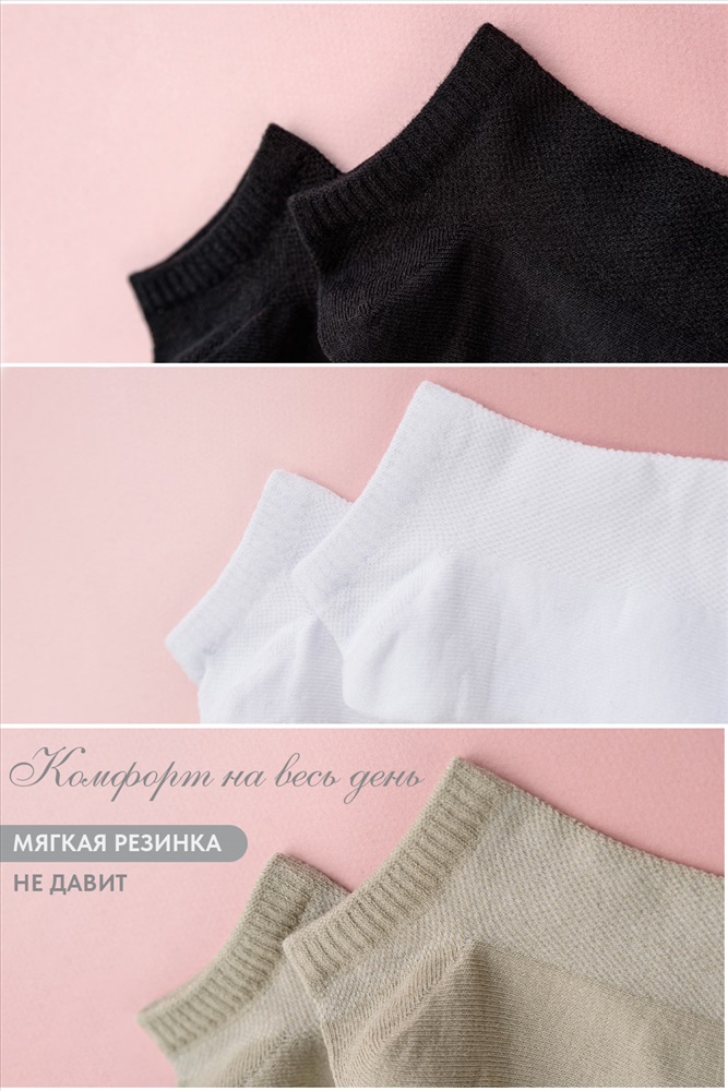 Состав: 75% х/б 20% ПА 5% эластан Модель: Носки женские Ялта (набор 3 пары) Тип товара: носки короткие Материал: чулочно-носочный трикотаж | чулочно-носочный трикотаж Бренд: Amichevole Berchelli НДС: 22% Рейтинг: Рейтинг 4 и выше Рисунок: однотонные Сезонность: лето | осень | весна | зима Стиль: повседневный | спортивный Набор женских носков. В комплекте 3 пары одного цвета или комплект где собраны все три цвета. Летняя модель с сеткой по верхней стороне. Состав ткани: 75 % х/б, 20% спандекс, 5% п/а. Таблица размеров и веса