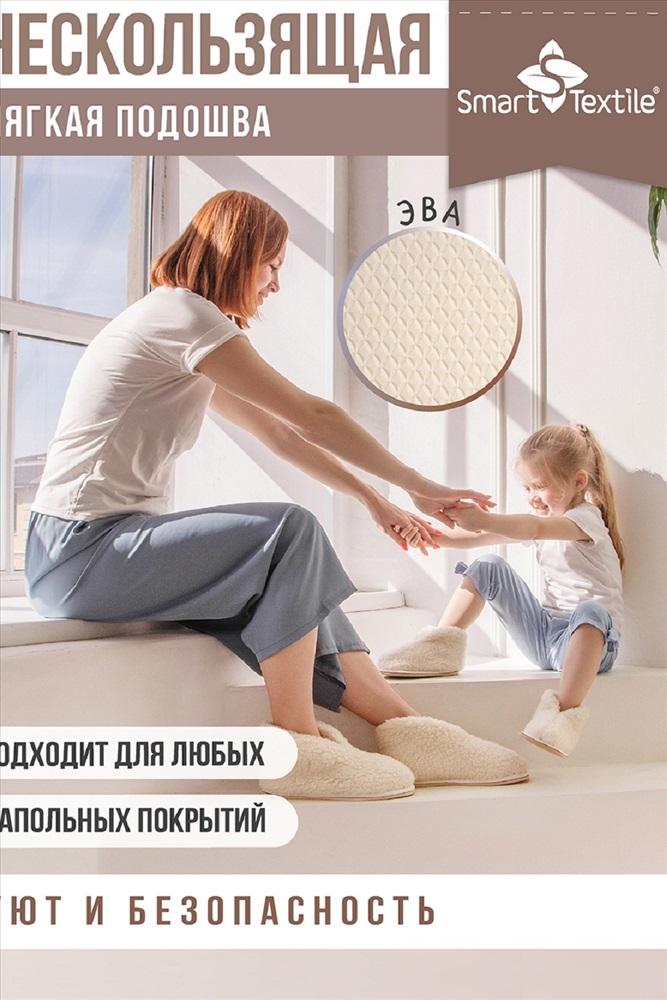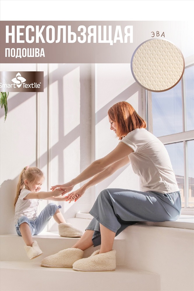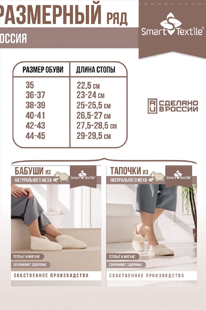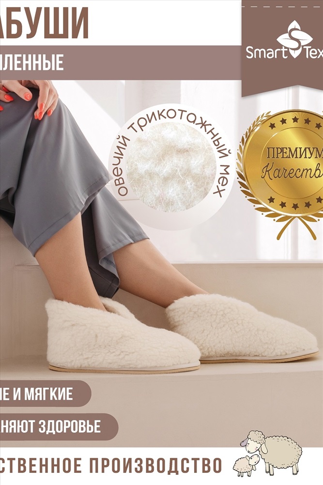 Стиль: домашний Бабуши из овечьего меха, или, как их еще называют, чуни отличная альтернатива обычным домашним тапочкам, они обязательно должны быть в каждом доме и у каждого члена семьи. Полезная и удобная меховая обувь особенно пригодится в холодное время года вернувшись домой с улицы с замерзшими или промокшими ногами, первым делом надевайте бабуши сразу согреетесь и сможете защититься от простуды. Овечий мех, из которого сшиты бабуши, прекрасно согревает, создавая внутри тапочек эффект сухого тепла, отводя излишнюю влагу, поэтому внутри бабуш всегда тепло и сухо. Ворсинки меха приятно массируют кожу ног, улучшая кровообращение, помогая избавиться от отеков, устранить ноющую боль от усталости, расслабить мышцы. Бабуши закрывают щиколотку, что полезно для людей, страдающих от заболеваний суставов ступней сухое тепло и микромассажное воздействие благотворно влияют на состояние здоровья суставов, связок и мышц. Купив бабуши в подарок, можно и порадовать близкого человека вниманием и заботой, и вручить действительно полезную вещь, которая будет оценена по достоинству и не будет пылиться на полке, ведь уют и комфорт нужны нам всем. Красивые, практичные и удобные бабуши (чуни) из меха овцы помогут вам моментально согреть ножки и доставят истинное удовольствие. Мягкие, приятные на ощупь укороченные чуни из овчины один из лучших видов домашней обуви, особенно в холодное время года. Но меховые изделия стоят весьма недешево. Вы думаете, подобная роскошь не по карману? Специальный Текстиль под брендом Умный текстиль выпустил прекрасную модель этой серии Эконом. При изготовлении используется материал, состоящий из 30% натурального меха и 70% ПЭ. Это делает продукт значительно дешевле, при этом сохраняется большинство положительных свойств шерсти. Полиэстер отличается износостойкостью, он прочный, что гарантирует износостойкость. Он обладает антистатическим эффектом, не мнется, хорошо держит форму. В сочетании с натуральной добавкой ткань выходит практичной, легкой в уходе. Овечья шерсть уникальный материал. Он обладает массой полезных для здоровья качеств: отлично согревает, благотворно влияет на кожу, действует, как обезболивающие и антисептическое средство. Изделия из этих материалов отлично подходят людям с такими проблемами, как артриты, артрозы, ревматизм. В наличии самые разные размеры модели, поэтому вы без проблем можете купить себе бабуши (чуни) из овчины или близким это легкое, нежное белое чудо. Не зря продукция объединения вошла в число 100 лучших товаров России. Передовые разработки и новейшие технологии позволяют нам создавать уникальные товары для вашего комфорта и здоровья. Бабуши из овечьего меха Эконом - один из достойных образчиков полезной, стильной домашней обуви. Держите всегда свои ножки в тепле, ведь это сможет защитить вас от массы проблем, начиная от простудных заболеваний и заканчивая более серьезными болезнями. Изготовлены из овечьего меха, нанесенного на трикотажную основу. Овечий мех издавна зарекомендовал себя как отличное средство для уменьшения неприятных ощущений в суставах и улучшения кровообращения. Бабуши являются прекрасной альтернативой обыденным домашним тапочкам. Теплые и очень мягкие, они придают ощущение легкости уставшим ногам и защищают их от холода.