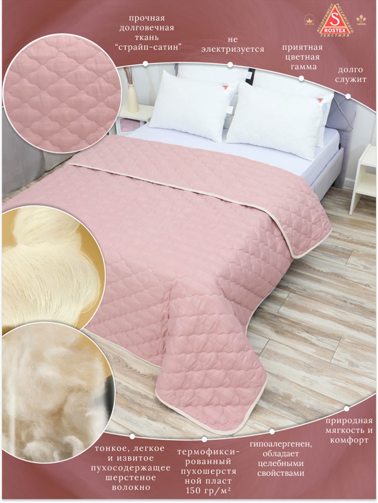 Состав: термофиксированное волокно, шерсть 40%, 60% п/э Модель: Одеяло Козий Пух коллекция линейки Люкс из натуральных наполнителей пл.150 гр/м2 Тип товара: одеяло Материал: наполнитель волокнистый | страйп-сатин | наполнитель волокнистый | страйп-сатин Бренд: ASROSTEX Назначение: для спальни Рисунок: однотонные Сезонность: лето | осень | весна | зима Одеяло Козий пух стёганное на многоигольной машине ,наполнитель натуральное пухосодержащее шерстяное термофиксированное волокно, обладающее целебными свойствами, оказывает оздоровительное воздействие на организм. Гипоаллергенное, состоящее из белкосодержащих соединений, тонкое извилистое лёгкое волокно животного происхождения, долгого срока службы в обиходе. Таблица размеров и веса