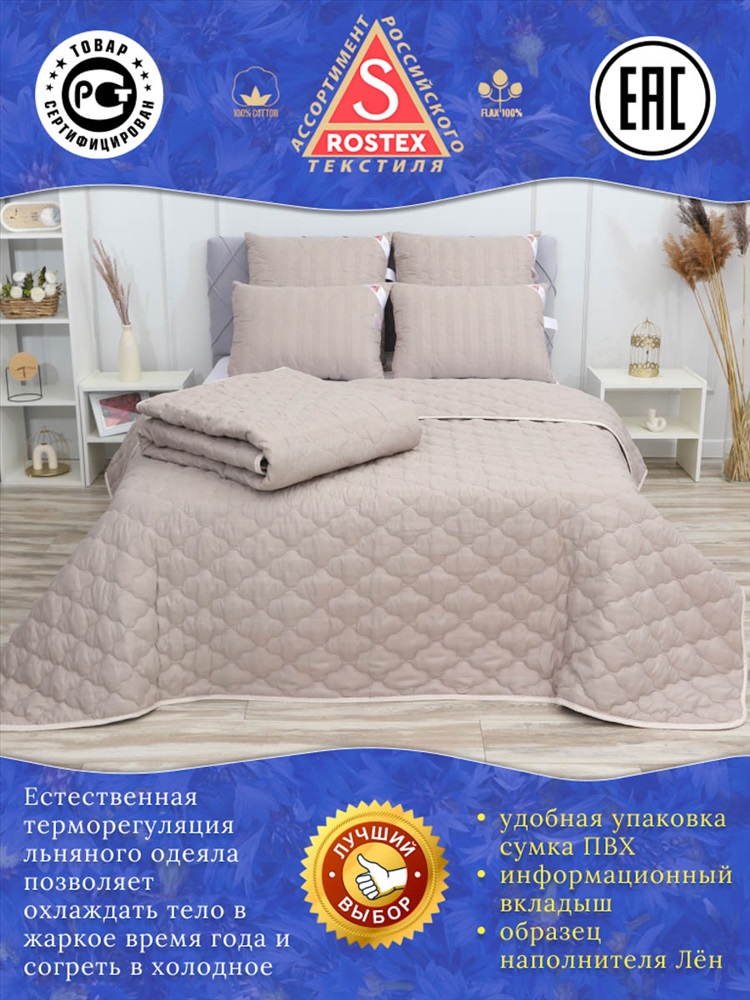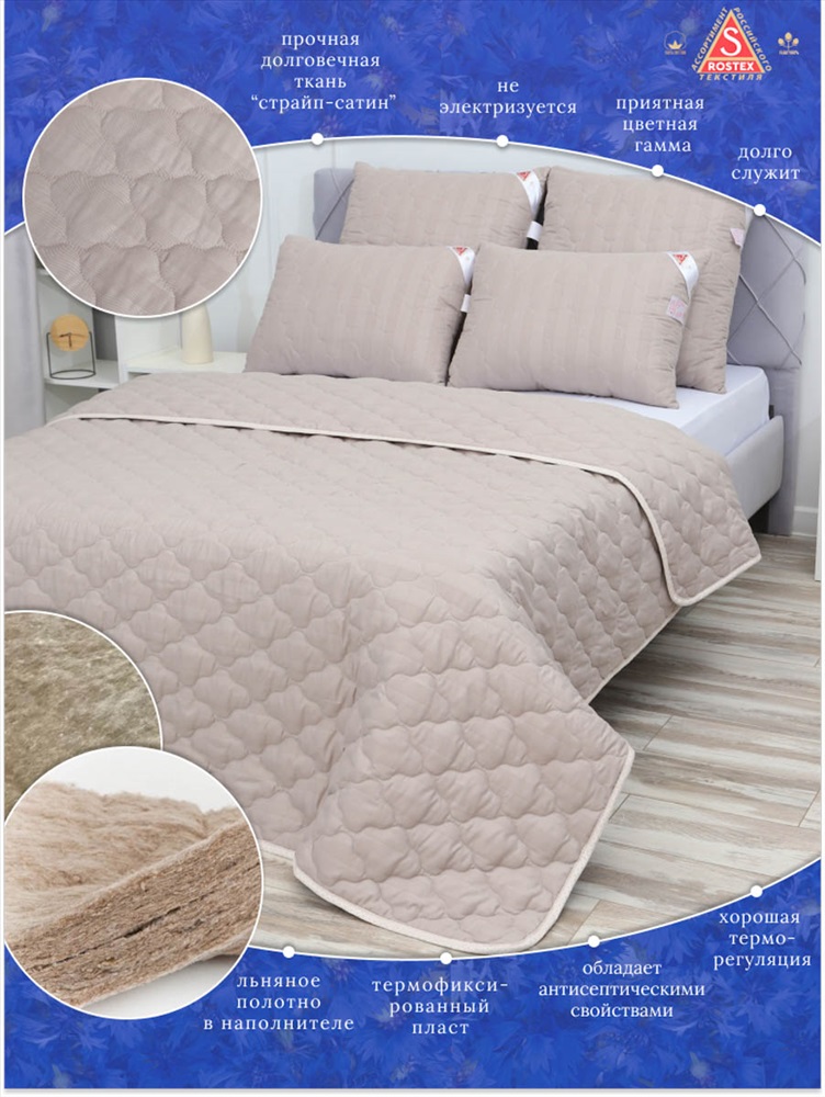 Состав: Натуральный Лён пласт 150гр.м2, 40%лён, 60%п/э. Модель: Одеяло Лён плотностью 150гр.м2, коллекция линейки Люкс из натуральных наполнителей. Тип товара: одеяло Материал: страйп-сатин | страйп-сатин Бренд: ASROSTEX Назначение: для спальни Рисунок: однотонные Сезонность: лето | осень | весна | зима Одеяло Лён, стёганное на многоигольной машине из высококачественной ткани страйп-сатин, наполнитель натуральное термоскреплённое волокно лён пласт. Льняное волокно это плотный однородный наполнитель, не портится со временем, хорошо держит форму, гипоаллергенный, обладает антисептическими свойствами и хорошей терморегуляцией, не боится моли, долго служит. Естественная терморегуляция волокон позволяет охладить тело в жаркое время года и согреть в холодное. Таблица размеров и веса