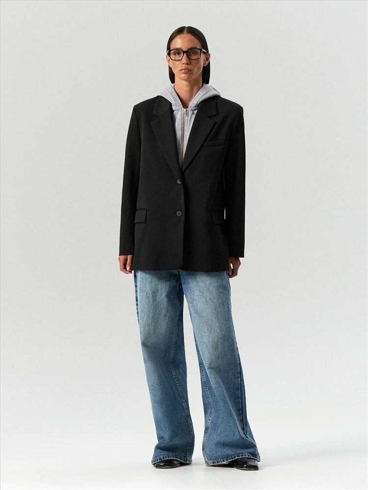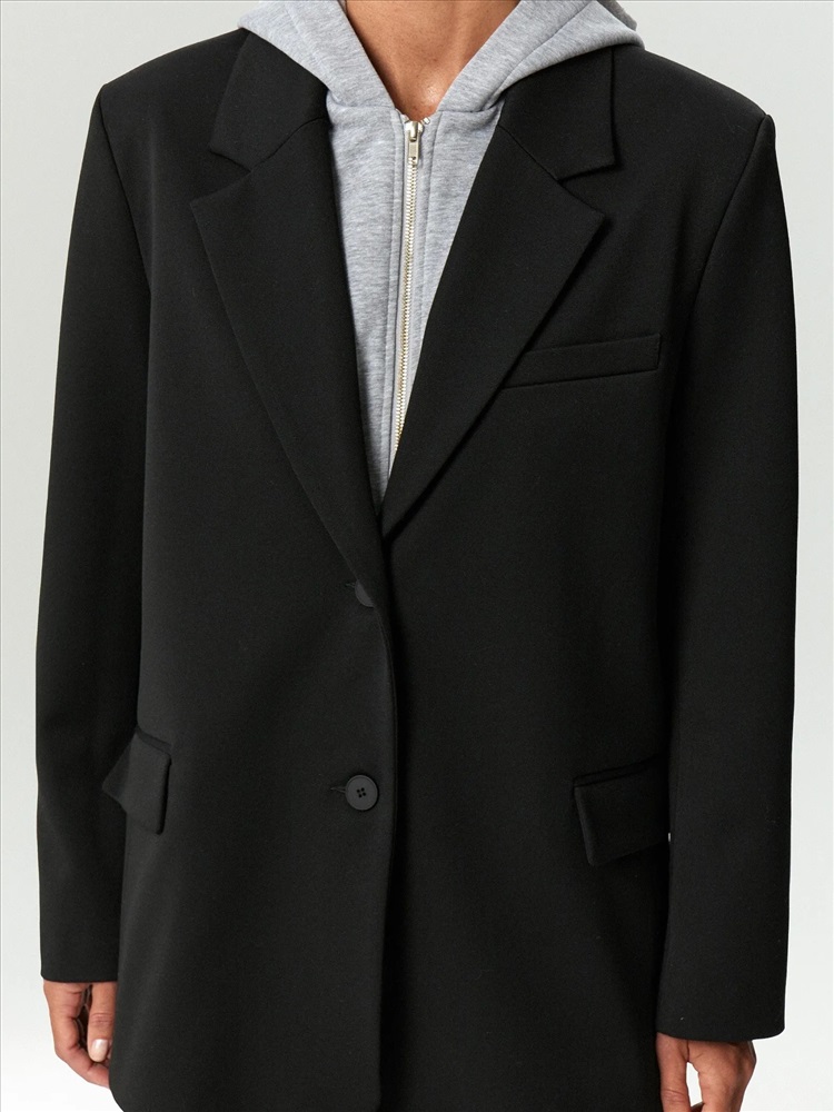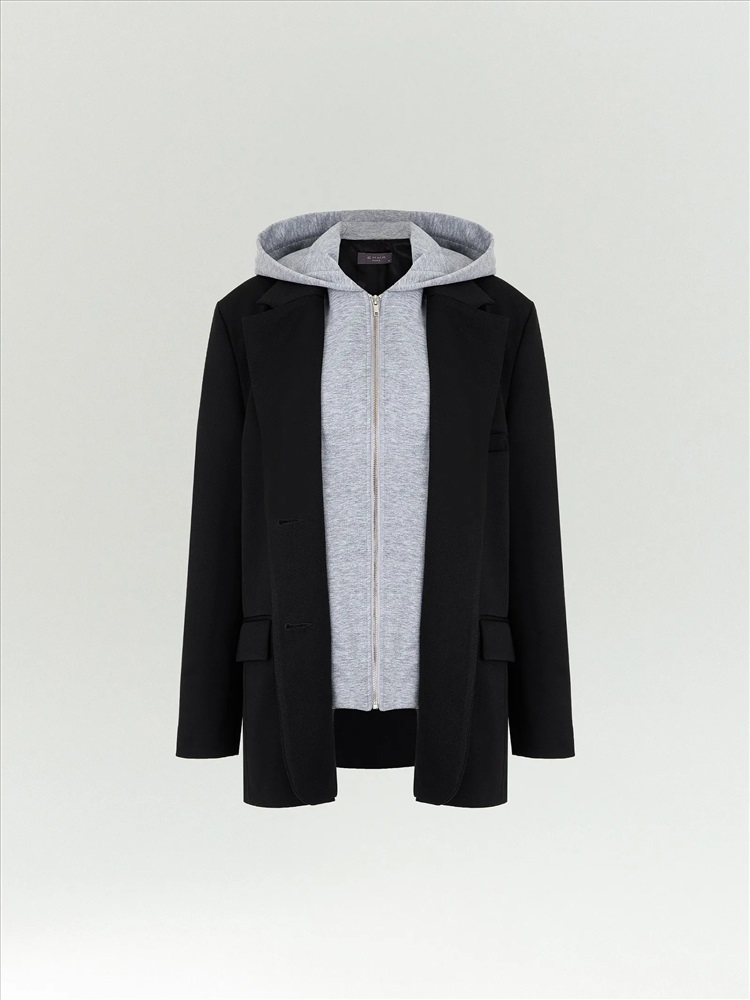 Жакет с имитацией худи отражает модную игру с деконструированными формами и создаёт эффект многослойности. Это креативный и комфортный вариант верхнего слоя на смену пальто и курткам. Можно застилизовать с простой белой рубашкой и леггинсами, можно носить с базовым денимом и костюмными брюками. Жакет может стать частью капсулы с комплектом emma из предыдущих коллекций.
