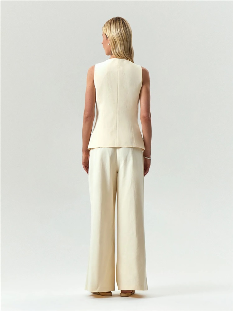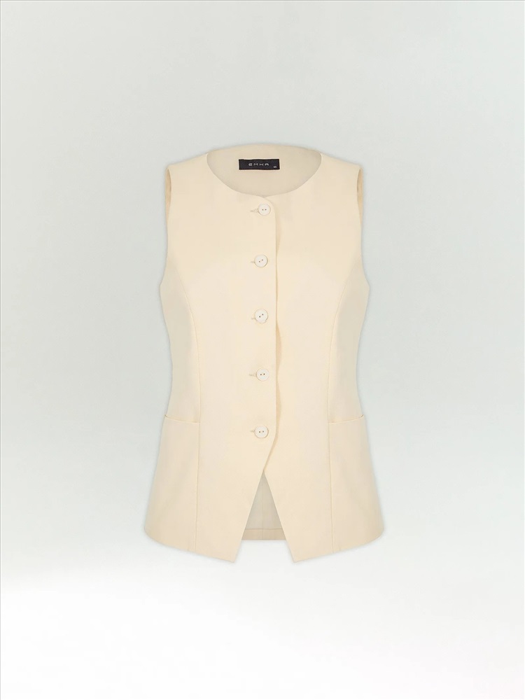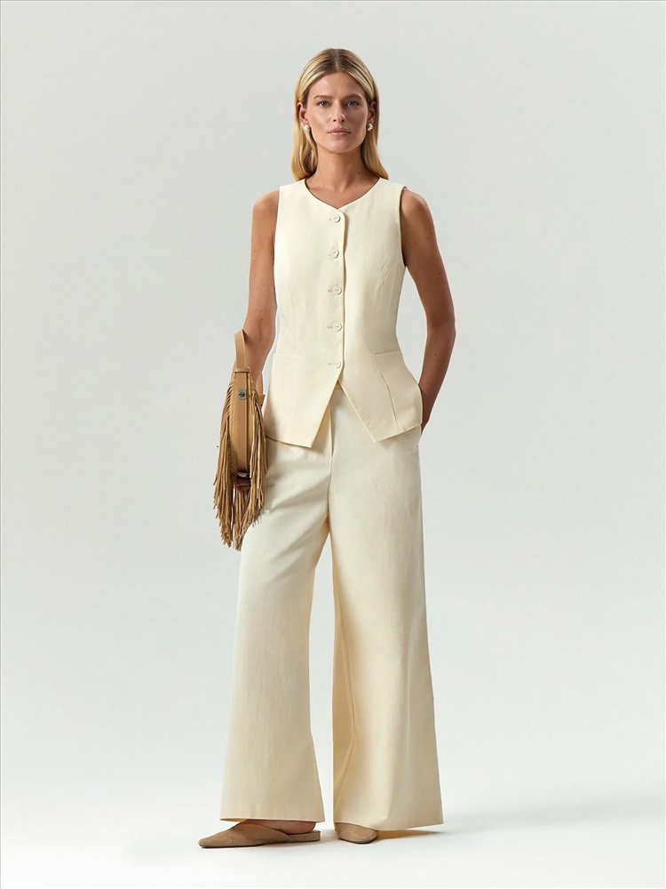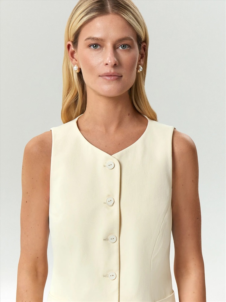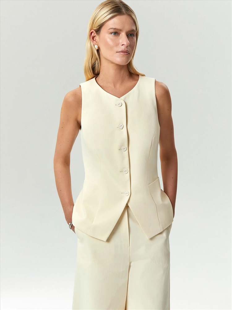 Модный жилет в молочном цвете. Материал состоит полностью из хлопка, что делает его идеальным выбором на лето. Модель приталенного кроя имеет фигурную линию борта и дополнена вместительными карманами, уходящими в линию вытачек. Завершить образ можно брюками из комплекта. Изделие изготовлено на подкладке с хлопком.