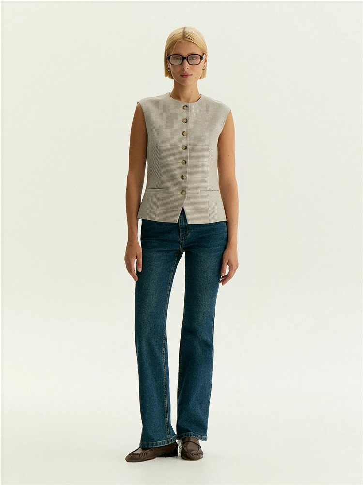 Хлопковый жилет в гусиную лапку и с пуговицами под рог сделает более концептуальными повседневные и деловые образы. Ряд пуговиц идёт от горловины до низа, а вырез сделан под горло, что добавляет нотку интеллектуальной строгости. Лёгкая приталенность адаптирует идею фасона "с мужского плеча" под изящную женскую фигуру. Дополнить образ можно синими, серыми или коричневыми джинсами, лаконичными тёмно-серыми брюками и другими вариантами низа. Жилет сделан на подкладке с хлопком.