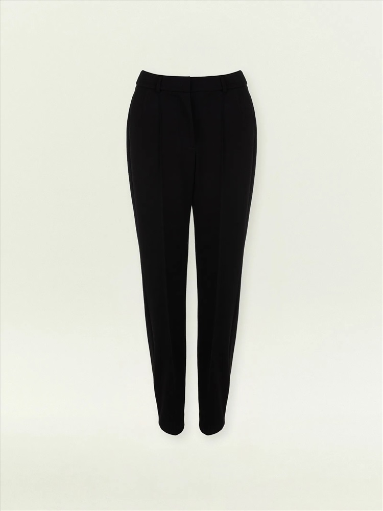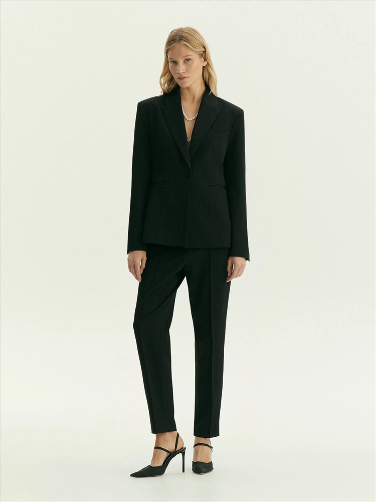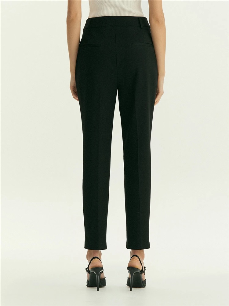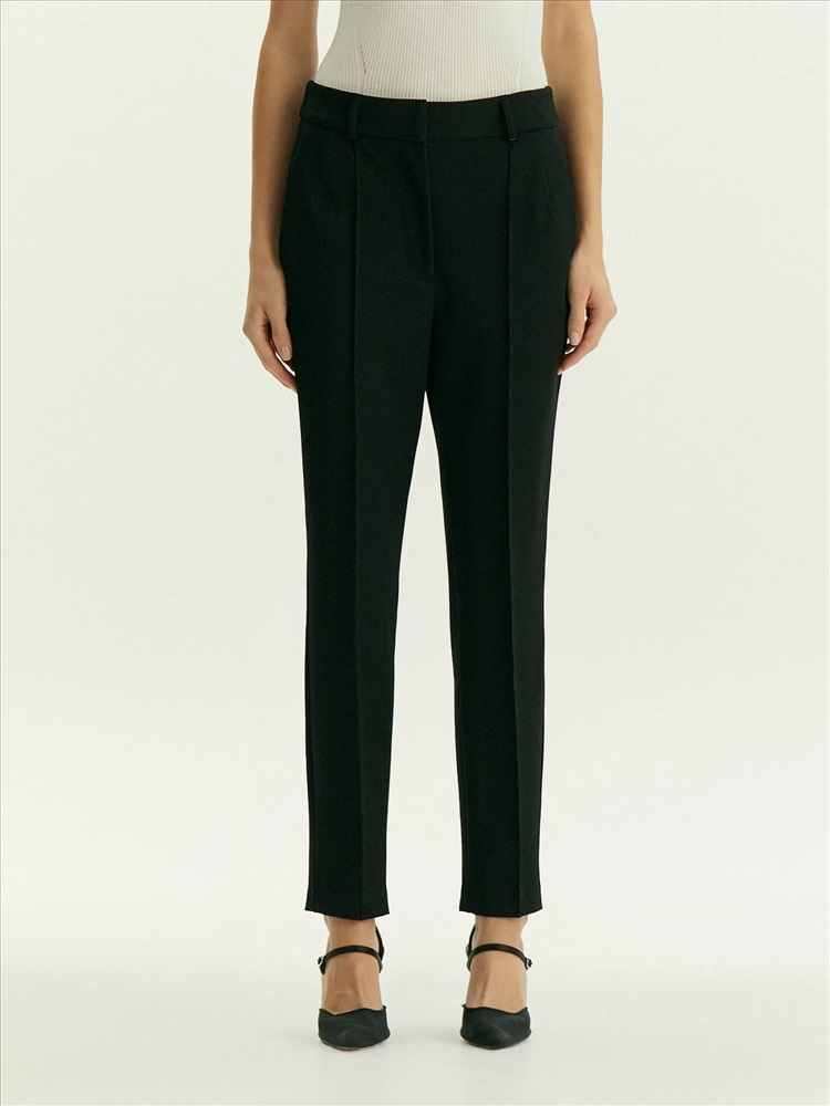 Незаменимые чёрные брюки на любой случай. Стильная зауженная модель в длине 7/8 с высокой посадкой имеет простроченную стрелку спереди. Выполнены из материала с содержанием дышащей вискозы и эластана для ещё более комфортной посадки по фигуре. Завершить образ с брюками можно жакетом из комплекта. Также они могут стать частью капсулы с другими моделями линейки emma.