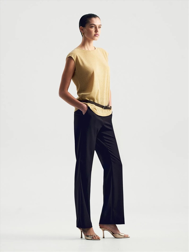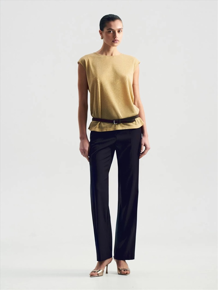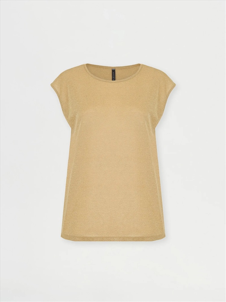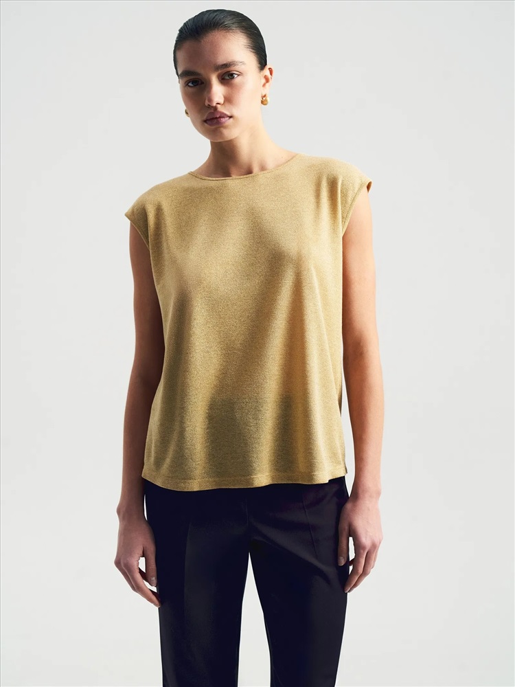 Бежевый топ с золотистым люрексом станет любимой вещью в гардеробе. Подходит не только на особый случай, но и чтобы поднять настроение в будни.