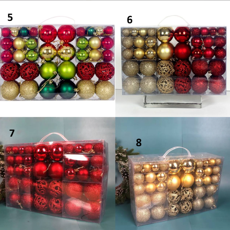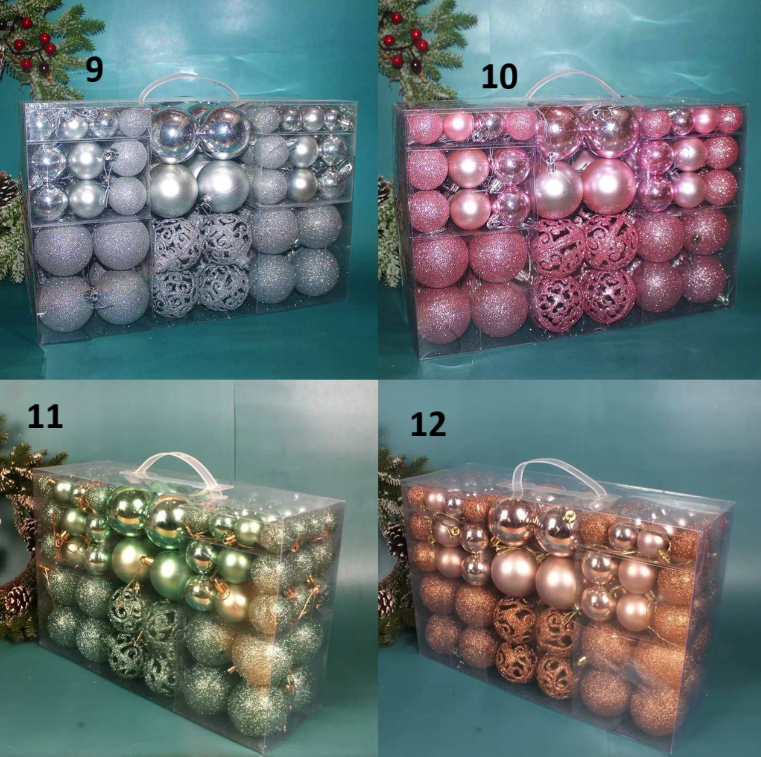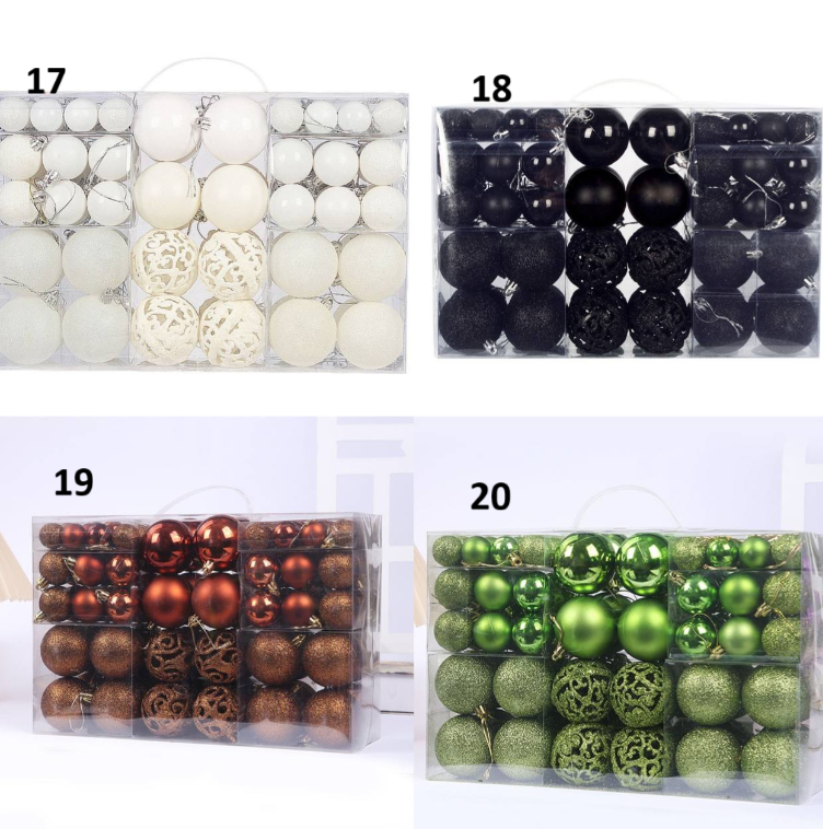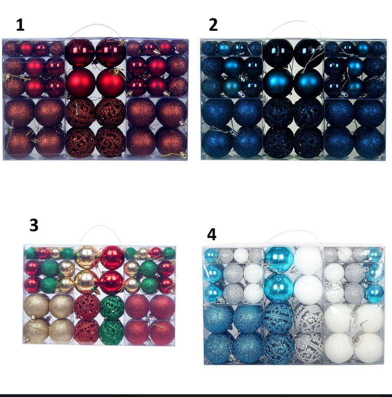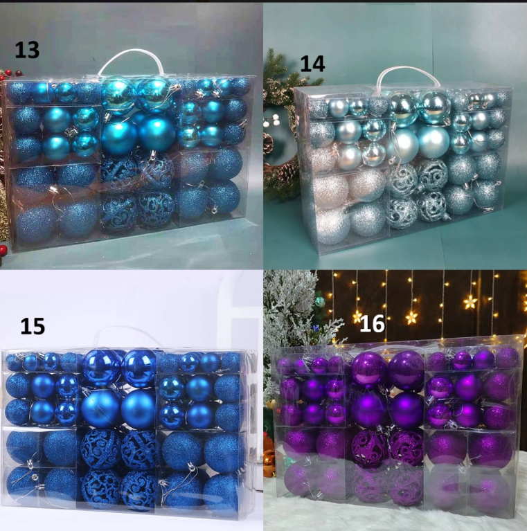 диаметр 3см - 32шт диаметр 4см - 36шт диаметр 6см - 32шт Есть матовые, глянцевые и глиттерные шары Материал: пластик Комментарии к товару