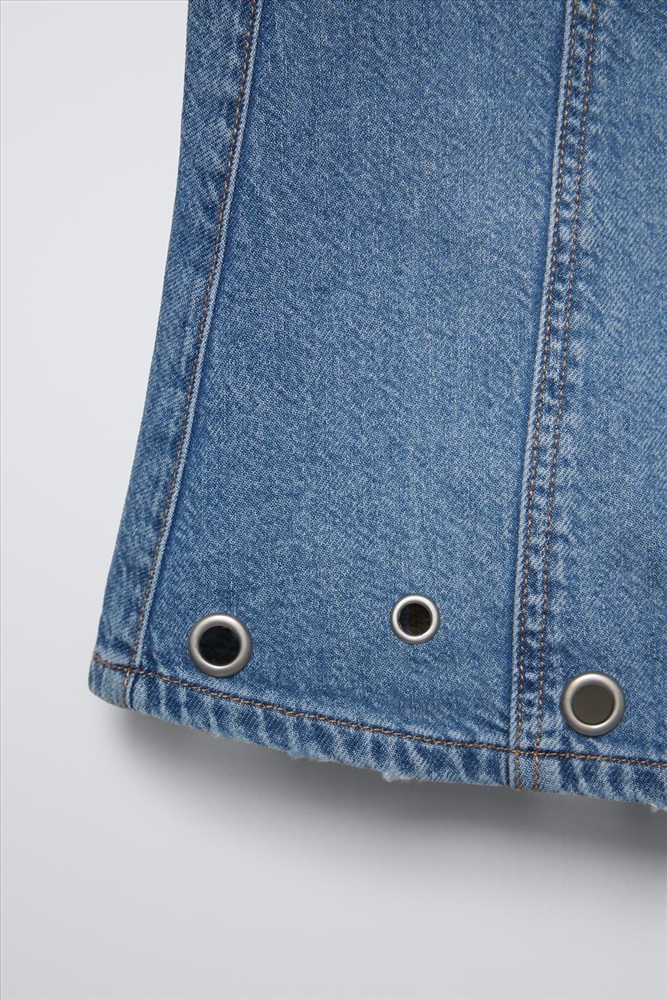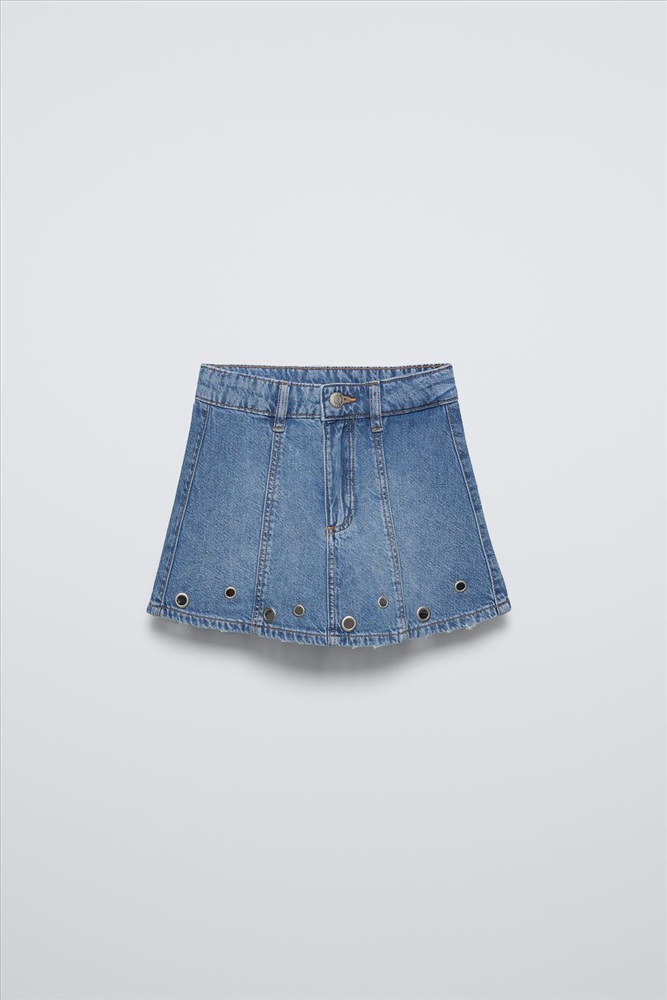 Denim skirt with an adjustable inner waistband and front button fastening. Featuring a metal openwork detail on the hem.
