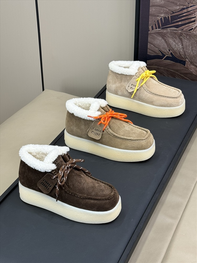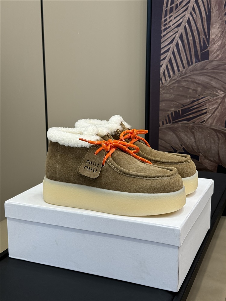 Осенне-зимние повседневные туфли Miu 24 на толстой меховой подошве. Утолщенная подошва контрастного цвета хорошо увеличивает рост. Замшевый верх имеет нежную текстуру, а цвет хорошо сочетается с осенне-зимним периодом. Подкладка из овечьей шерсти