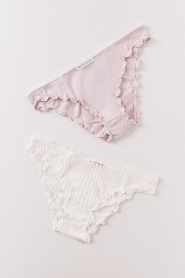 Pack de 2 bragas clásicas, ideales para quienes buscan comodidad y cobertura ajustada. Confeccionadas con tejido de algodón, con detalles de volantitos y puntilla en la cinturilla.