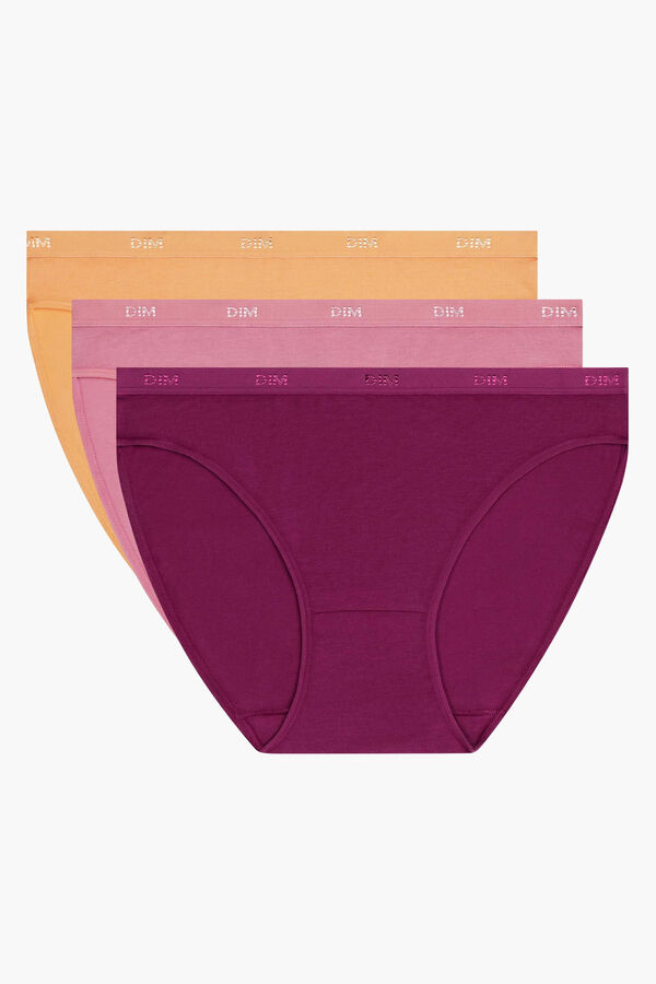 Pack de 3 Bragas de algodón elástico coloridas y muy cómodas. Para evitar que se marquen bajo la ropa y para un extra de confort, hemos usado una cinturilla ancha con el logo de DIM. Elástico plano y costuras recubiertas en las piernas.