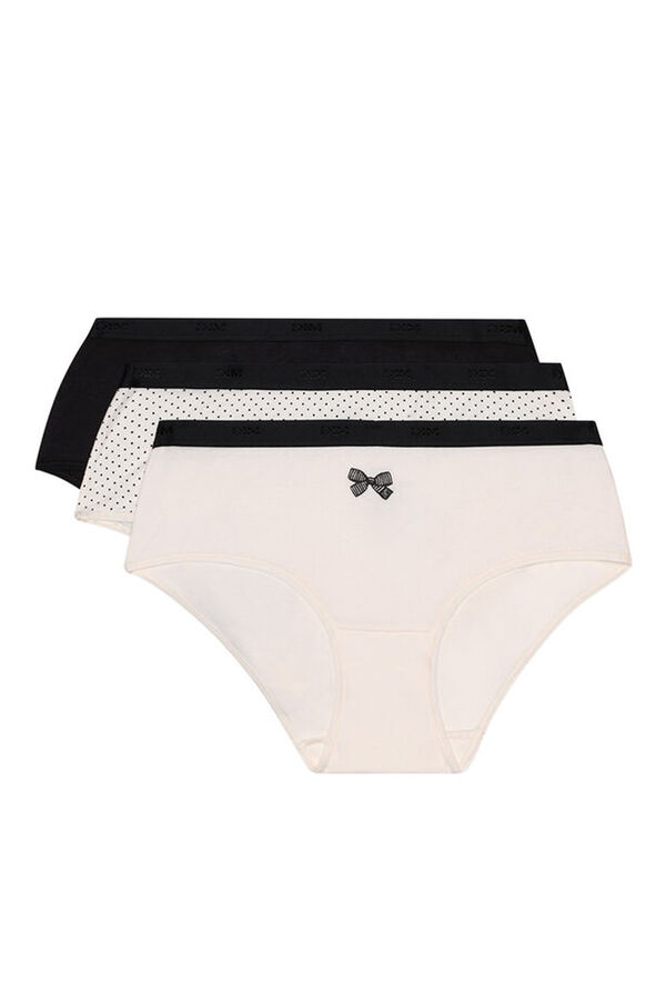 Pack de 3 bóxer de algodón elástico con diseños juveniles y divertidos, así como colores básicos. Mezcla de braguitas lisas, estampadas o con detalles en colores de moda basados en las tendencias de la temporada. Cinturilla plana con logo y elástico invisible en las piernas.