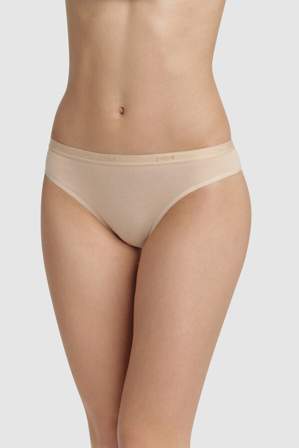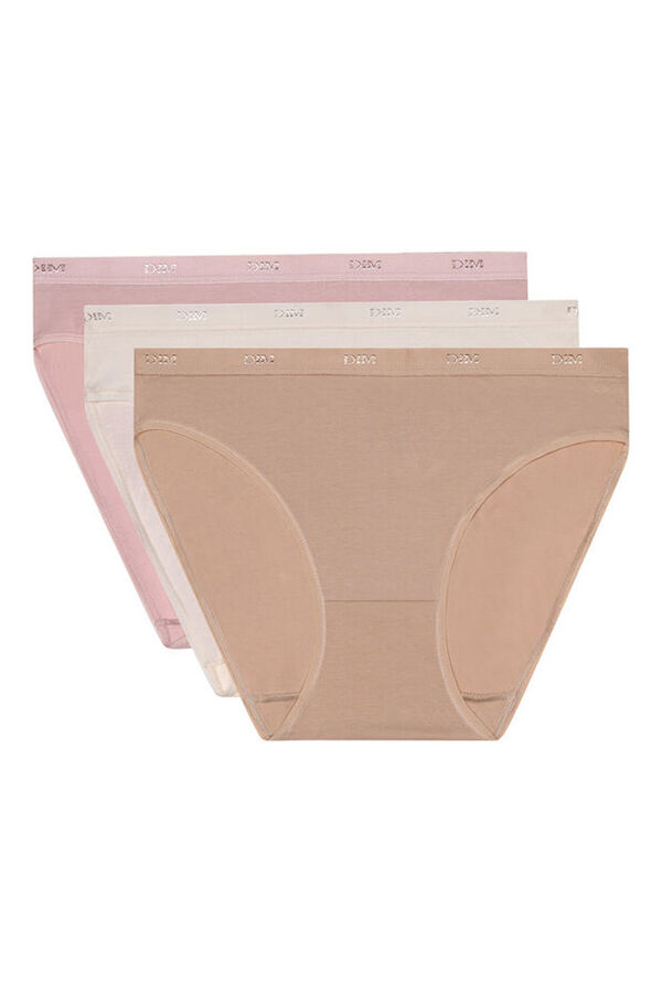Pack de 3 braguitas de algodón elástico coloridas y muy cómodas. Para evitar que se marquen bajo la ropa y para un extra de confort, hemos usado una cinturilla ancha con el logo de DIM. Elástico plano y costuras recubiertas en las piernas.