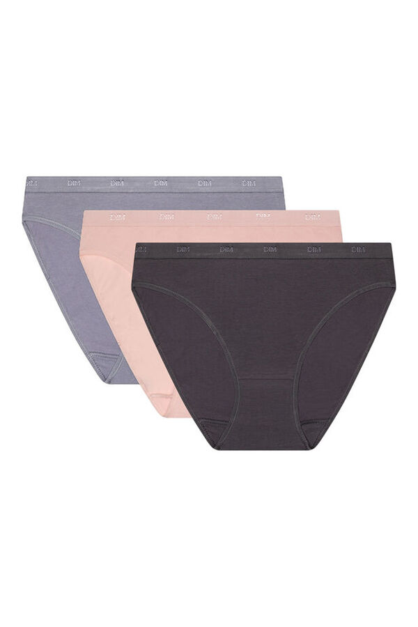 Pack de 3 braguitas de algodón elástico coloridas y muy cómodas. Para evitar que se marquen bajo la ropa y para un extra de confort, hemos usado una cinturilla ancha con el logo de DIM. Elástico plano y costuras recubiertas en las piernas.